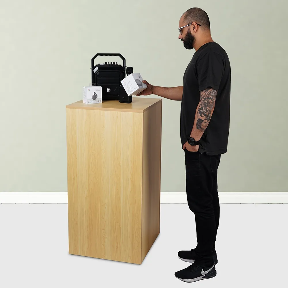A maple plinth, like retail pedestals and store fixtures, is made from laminated MDF that resembles real wood at a lower price whilst still offering great durability. The light wooden finish is great for use in many locations, including retail stores, museums, department stores, art galleries, and exhibition halls. This type of pedestal is great for displaying hero products of out of the box in stores or at trade shows for potential customers to examine, as well as a place to put take away brochures or even an iPad to have people enter their information for contests or mailing lists.