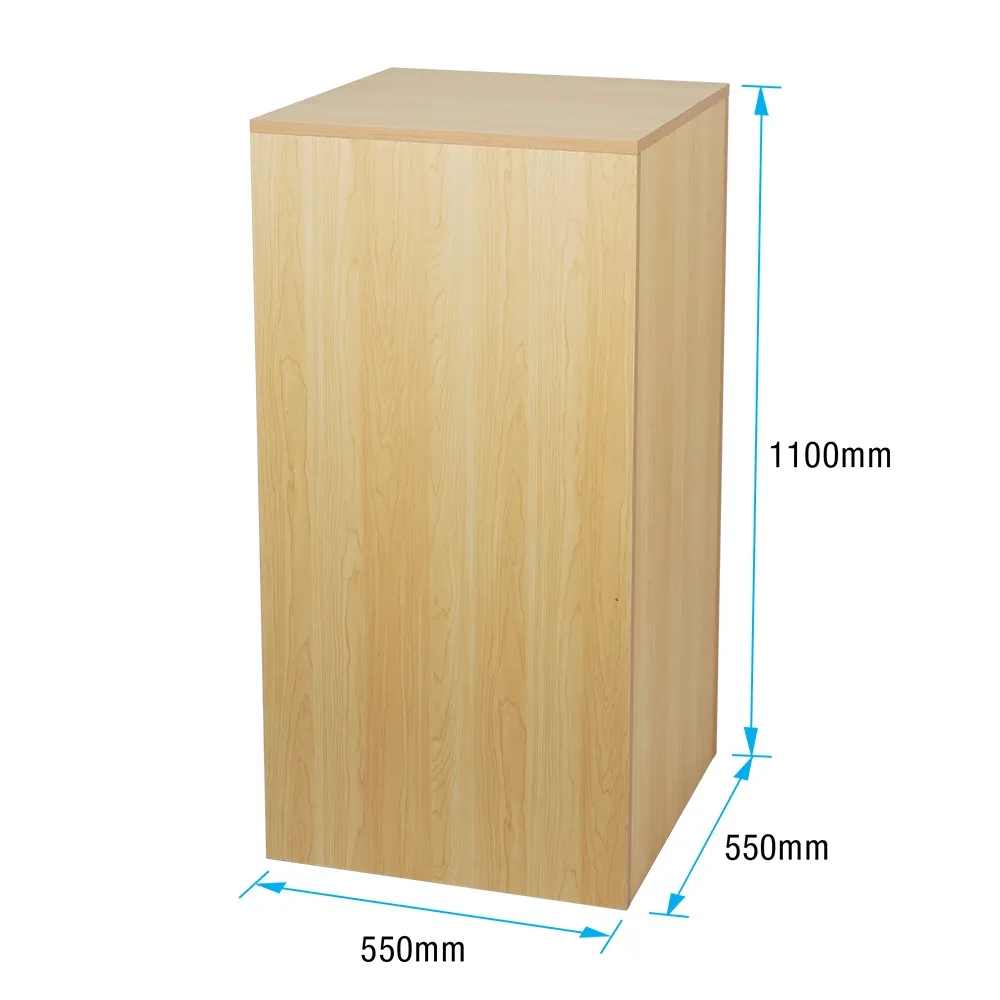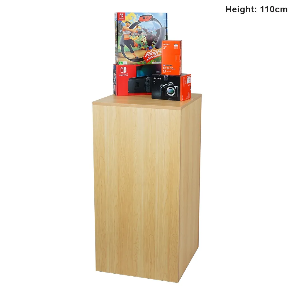 This maple plinth features a huge 55 x 55cm top area that can hold tablet stands, gallery pieces, hero products with take-away information, and more! The top surface is able to hold nearly any time that fits within the square with a maximum weight of 10kg. The wooden pedestal is 110cm tall, and can be used as a standalone unit or combined with other sizes of display plinths to show multiple items at once in different tiers to really get the attention of passersby.