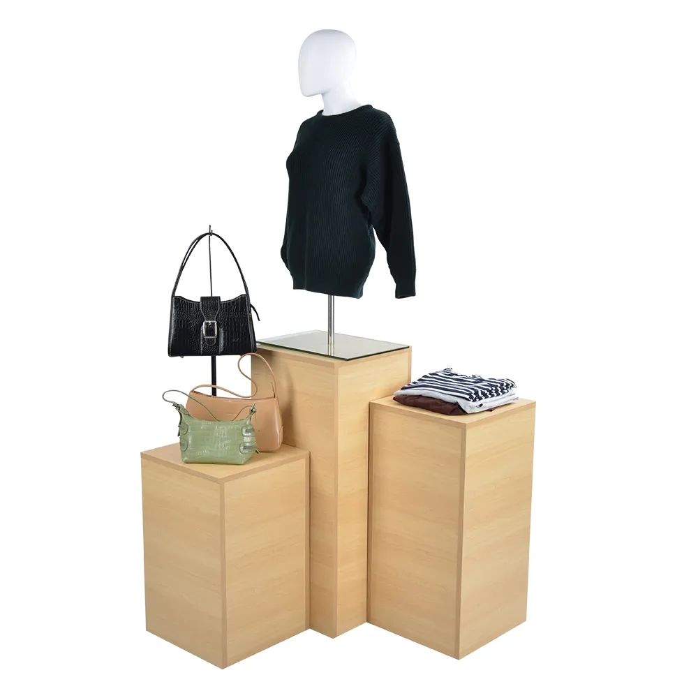 The store display fixtures, timber plinths each feature 38 x 38cm top surface areas, providing plenty of room for a variety of items to be safely displayed. Each plinth is able to hold standard sized items typically displayed on this type of pedestal, including vases, art pieces, toys, electronics, and clothing. The stands all are made of laminated wood with a maple finish, a classic retail look that is clean and acts as a neutral backdrop to items placed on display to help focus attention.