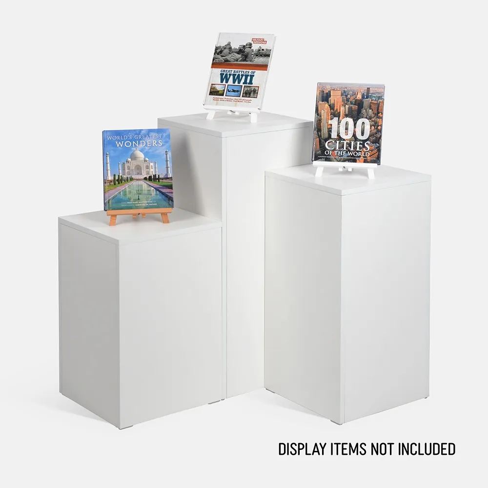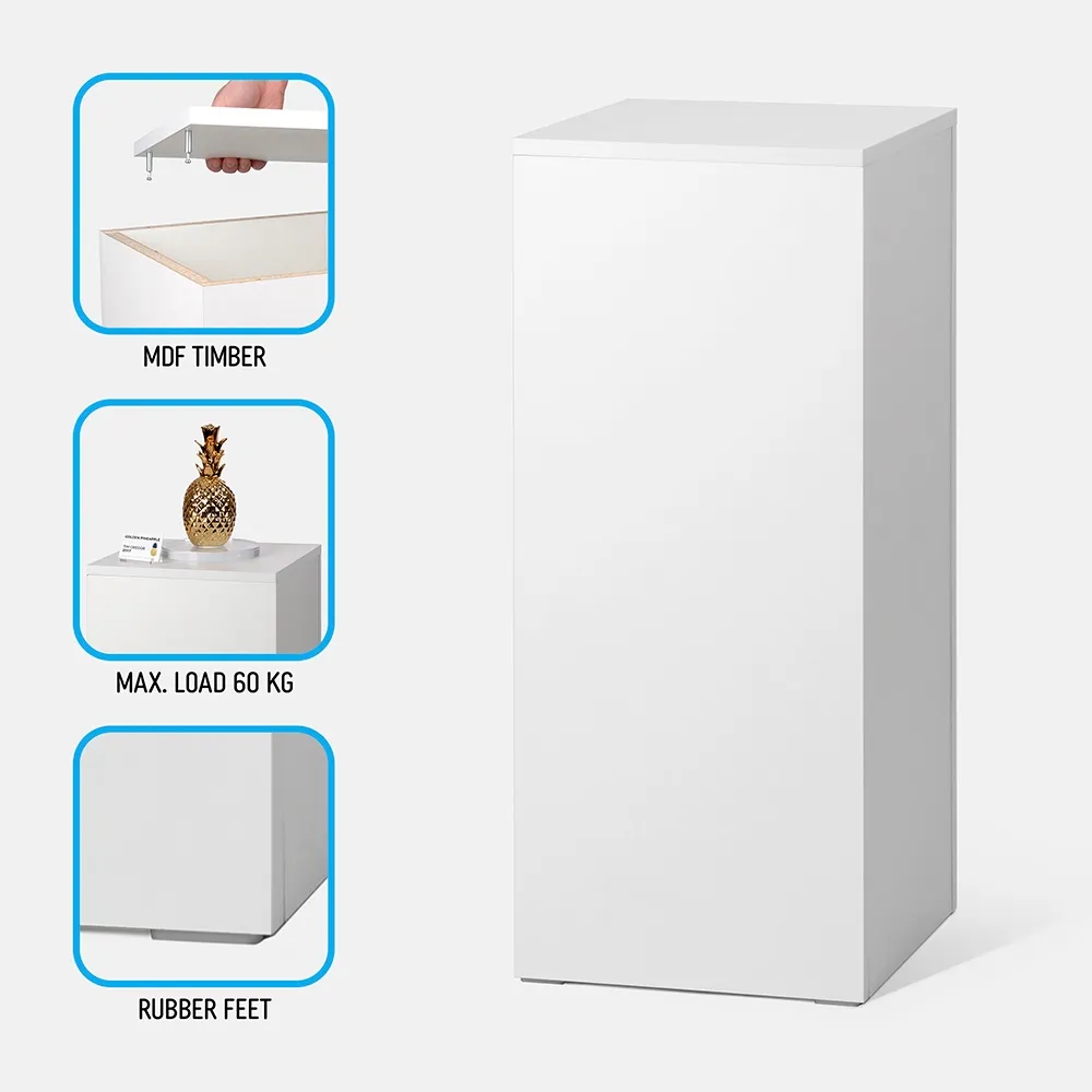 Use a plinth pedestal to elevate products to be better seen by visitors and potential customers at your business! The wood display stands feature a white finish on laminated timber, a neutral backdrop for displayed goods to be seen against to help highlight their appearance. The durable make of the stands make them perfect for retail stores, shopping centres, and even art galleries or museums to display pieces. Each column is able to easily hold standard items usually put on display with this style of fixture!