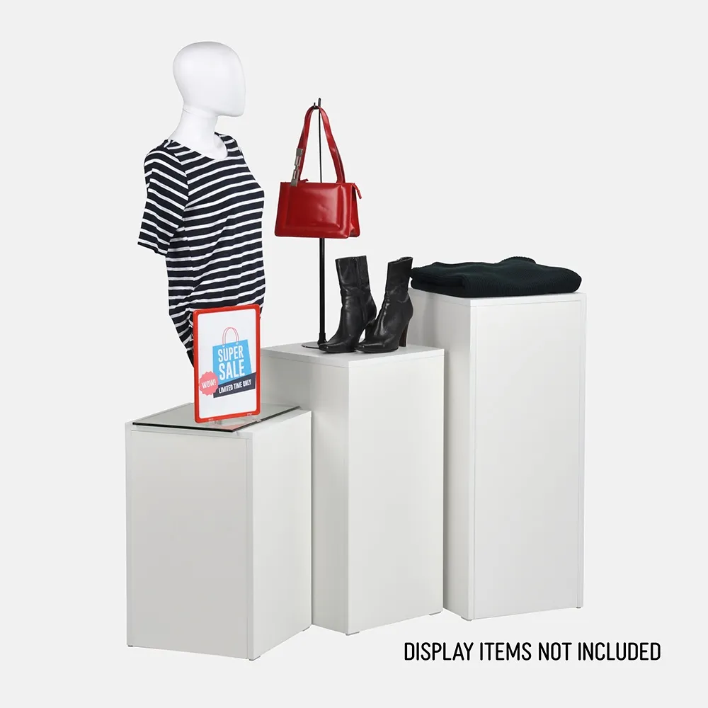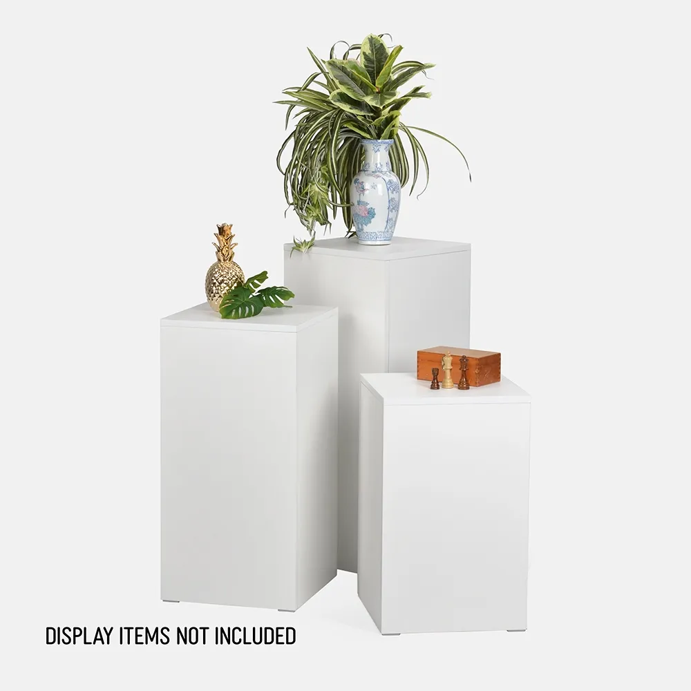 This plinth pedestal, part of our line of retail store fixtures, has (3) different heights included with your purchase. There are 61, 76, & 91cm tall pedestals in the set, and each have a 38 x 38cm top surface area to accommodate different sized items with ease. By elevating items using these stands, passersby will be able to better examine products or admire displayed goods. There are many configurations possible as well, with the lightweight column stands able to easily be positioned where they work best for your current set-up!