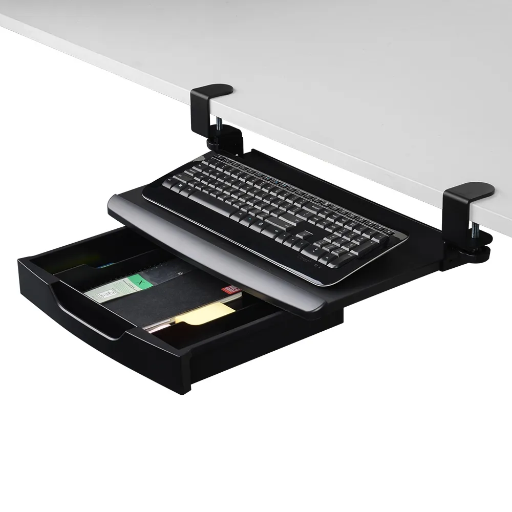 Keyboard holders are perfect for placing computer peripherals under a desk to keep them out of the way when not in use! The easy slide design makes it easy to pull the entire tray out or push it back under the tabletop effortlessly along the tracks. This keyboard tray features a large 510 x 310mm area that easily accommodates both keyboards and computer mice, keeping all your peripherals in one place! There is a drawer beneath the tray as well to hold additional items, with the large 370 x 270mm area split into 3 convenient sections to offer heaps of storage space as well as privacy. This attachable tray turns nearly any table into a usable desktop without damaging the surface itself.