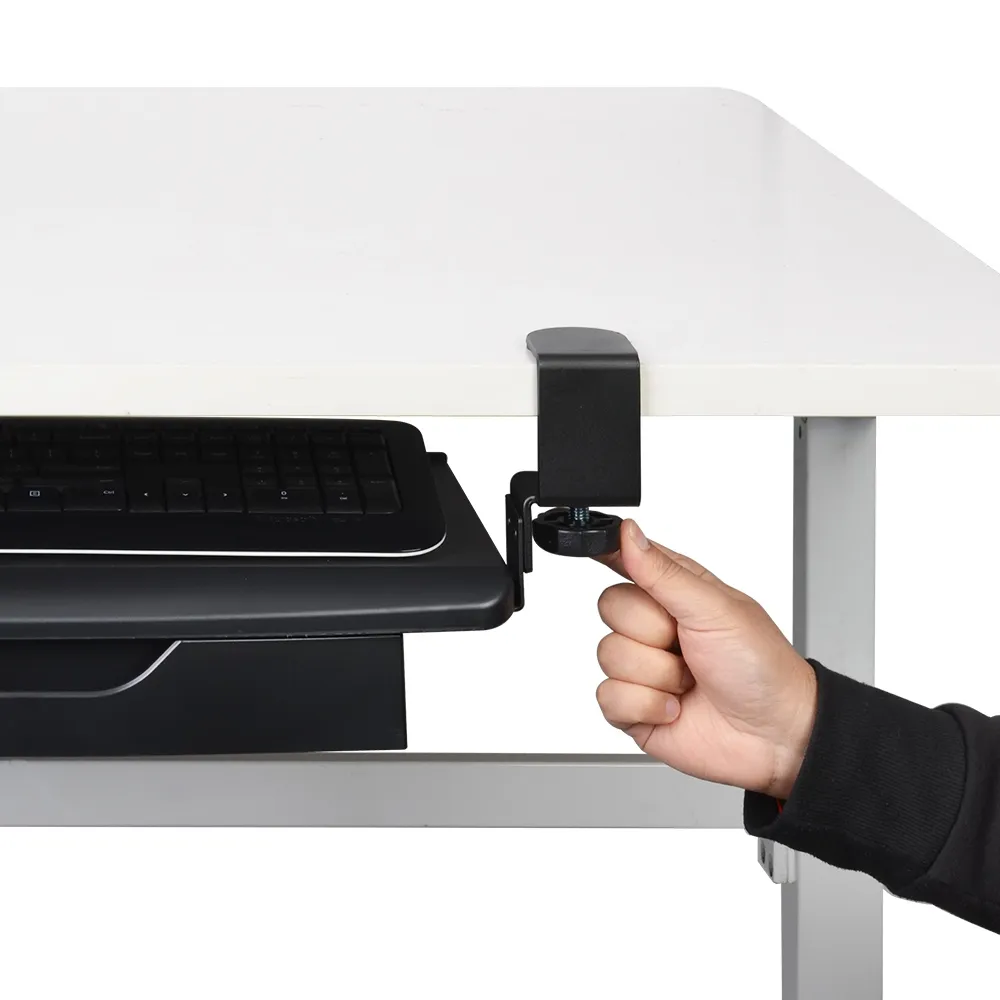 These keyboard holders, perfect for attaching to sit stand desks, feature an easy clamp design that installs onto most tabletops without screws required! Simply tighten the hand knobs on each clamp to secure the holder to surfaces up to 40mm in total thickness. The tray is made from hard-wearing plastic to hold up to daily use without issue, with the metal clamps ensuring hardiness whilst the protective pads that go against the actual surface of the table helps to prevent damage. The black finish can complement any colour of desk, and at only 2.9kg this unit can be affixed to the under side of any desk without worry.