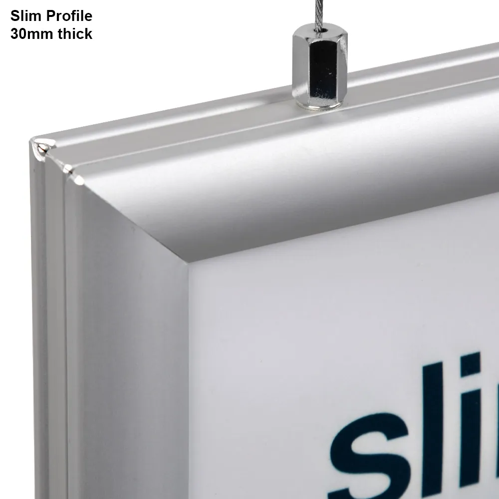 The frame is made from clear anodised aluminium with a natural silver finish, a professional look that works within any location whether a retail store, real estate agency, casino, or shopping centre. The sleek 30mm thin profile really works to the advantage of the stylish display, especially for a dual-sided light box like this. A standard 2m power cord is included to power the frame from where it is hung. Order by 3pm AEST to receive same day despatch to anywhere in Australia when in stock, only from Slimline Warehouse!