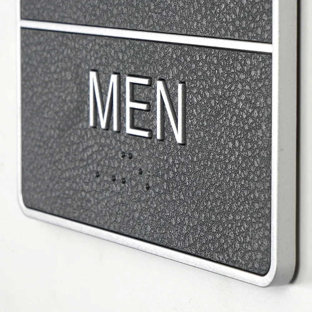 - ADA Men's restroom sign includes Braille lettering on bottom for visually impaired people