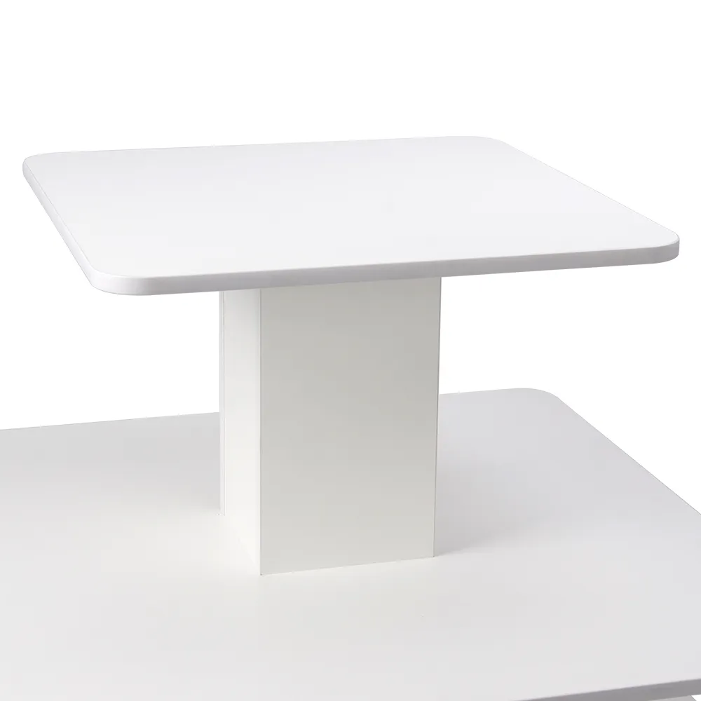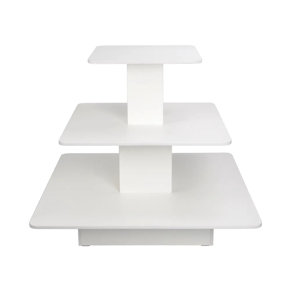 These retail clothing display tables, part of our line of Shop-Line retail store fixtures, are 1045mm tall with an overall footprint of 1225 x 1225mm to fit in with different locations easily. The lowest level of the display is 420mm off the ground to still be easily accessible. This display is made from laminated timber with a white finish that can fit in with any décor. The edges are also laminated on each level to complete the look and provide a professional appearance.