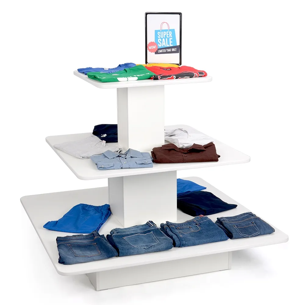 Retail clothing display tables are useful for holding product for customers to easily browse through, with heaps of space letting you provide plenty of choice! The display tables for retail stores feature (3) tiers for placing items, allowing for heaps of products in a single area to make it easy for potential customers or visitors to peruse whilst in your location. There is 900mm between the two lower shelves, with a 615 x 615mm top shelf that is ideal for placing sale signs or hero products to help capture attention.