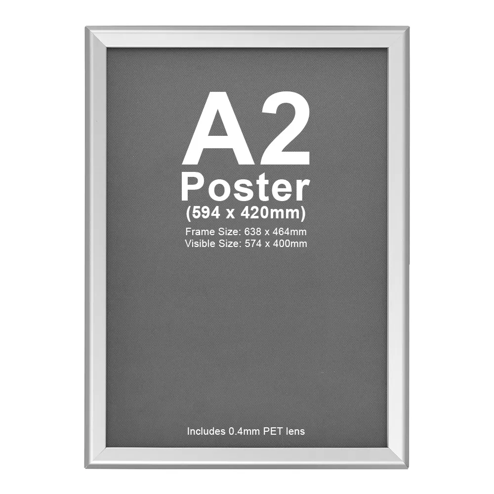The sign frames are a durable unit and they are also very easy to use. The sides of the sign frame simply lift out to release the poster and the protective lens. The poster sits securely between the plastic lens and the poster frame. Replace your advertisements at any time and hang the snap frame anywhere. With the mounting hardware included with the sign frame, you can start advertising within minutes. These sign frames also come in other sizes including A0, A1, A3 & A4. Our snap frames are individually packaged to minimise any chances of damage during fright and the snap frame arrives already assembled so you can start advertising the minute it arrives.