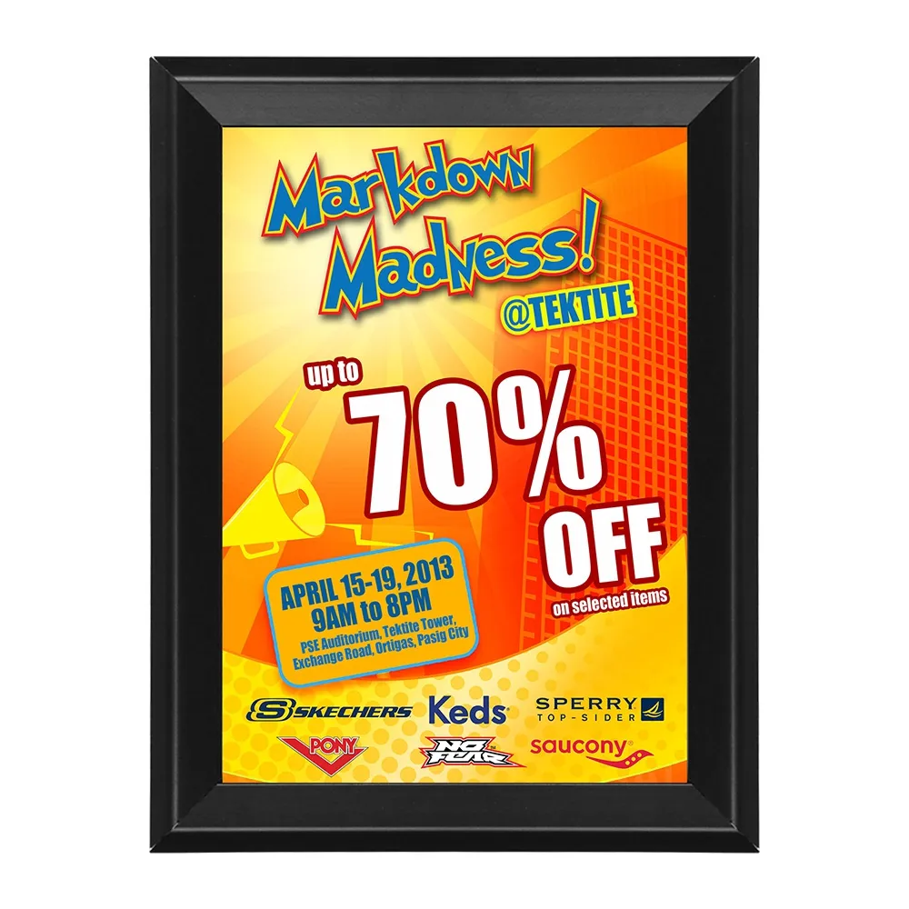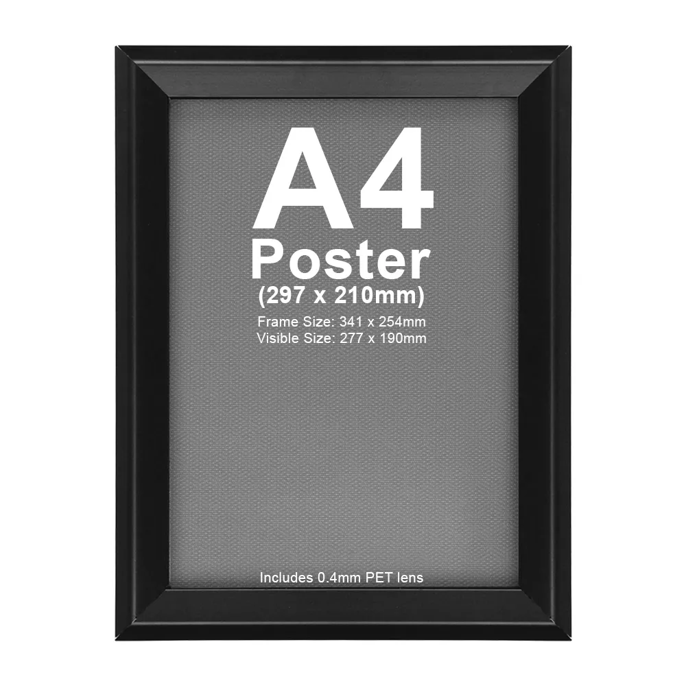 Sign frames in the heavy duty range are great for busy environments- with a heavy duty frame, anodised black, these snap frames can be displayed anywhere in your premises in portrait or landscape format. Hanging hardware is included with your unit and a plastic lens is added to protect your artwork to stop light from reflecting off your advertisement. These units are individually packed to minimise any chance of damage during shipping and we distribute to Australia wide.