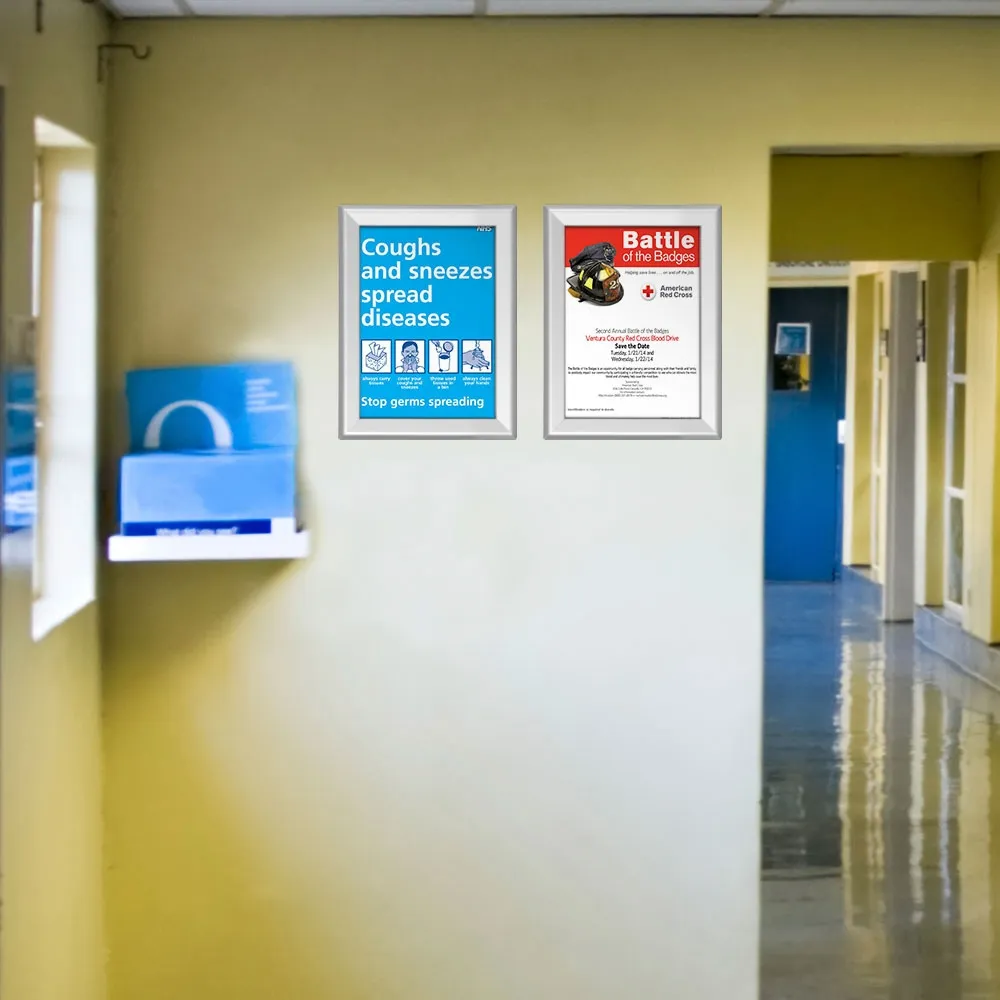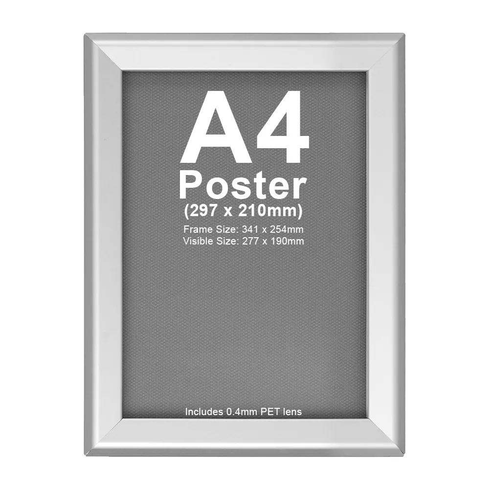 Sign frames are a great way to advertise in your busy premises. The sign frame is designed to withstand constant use and can hold a single sided A4 poster. These snap frames are made of aluminium and are easy to use. Hardware to mount your poster holder and a clear plastic lens is included with your snap frame. Our poster holders can be displayed in either landscape or portrait format giving you more flexibility when it comes to displaying your clip frame.