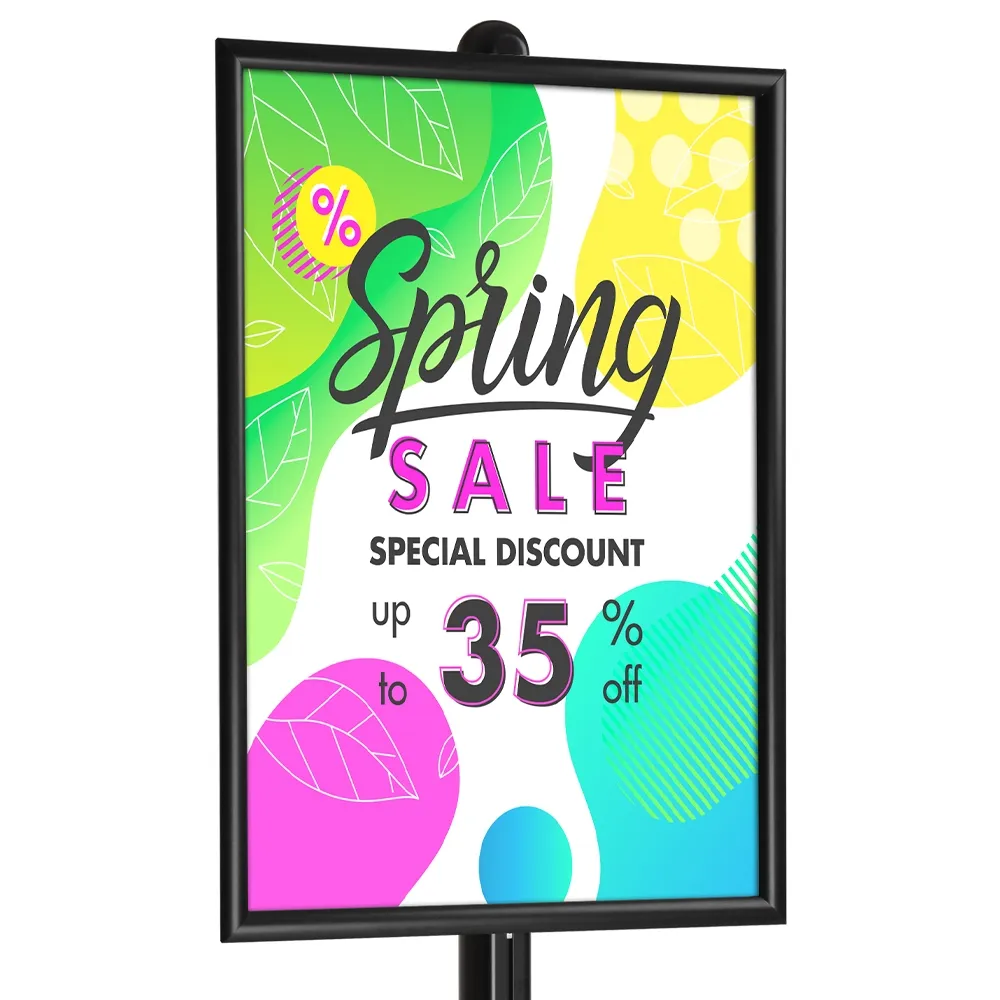 These black snap frames, designed for use with modular information stands, are height adjustable for easy placement along display stands where they will be best seen. You can purchase the clipframe to add to your existing floor display to add advertising posters to help entice customers towards you booth or store! This style of display is popular for trade shows, shopping centres, exhibition booths, transportation hubs, cinemas, car dealerships, and more!
