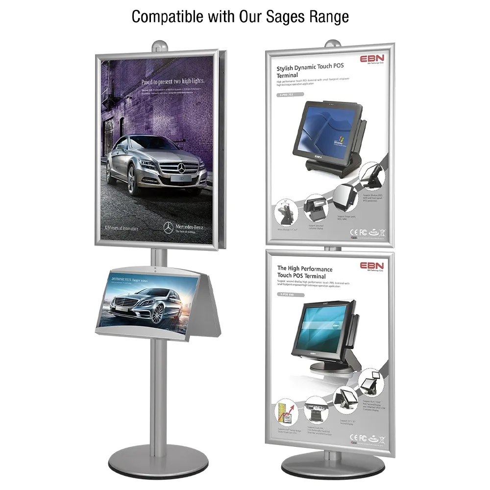 The Sages Series is a modular system that can be used with a wide range of other accessories such as: assorted poster sizes, brochure holders, printed banners and shelving configurations. The European styled stand can be easily manoeuvred around you premises to suit your needs and the range of accessories available provides versatile presentation of your graphics and advertising material.