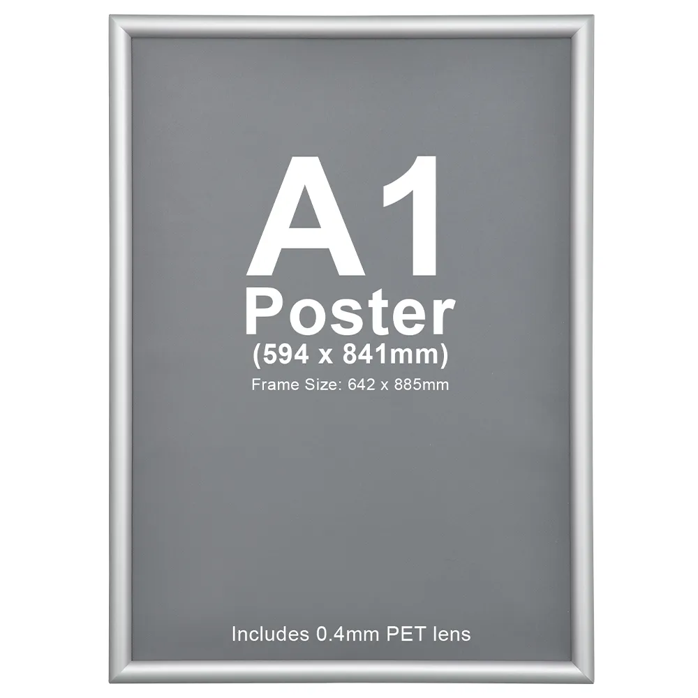 The A1 poster frame or snap frame is an integral part of our modular sages display system. The functional and stylish construction will complement your promotional graphics and draw attention to your advertising messages. Finished in silver anodized aluminium and weighing in at only 1.7 kg means that as well as being stylish and refined our A1 snap frame is also light and easy to assemble.
