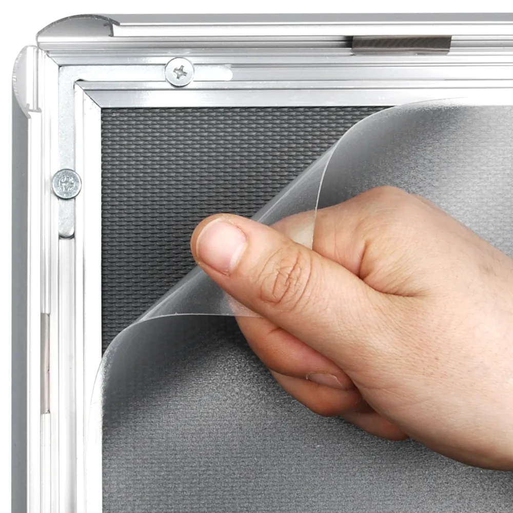 Our A2 poster frame uses Slimline Warehouse’s ingenious snap frame system, graphic changes are quick and easy taking just 60 seconds while a clear lens in each of your frames keeps poster clean and laying flat in the frame.