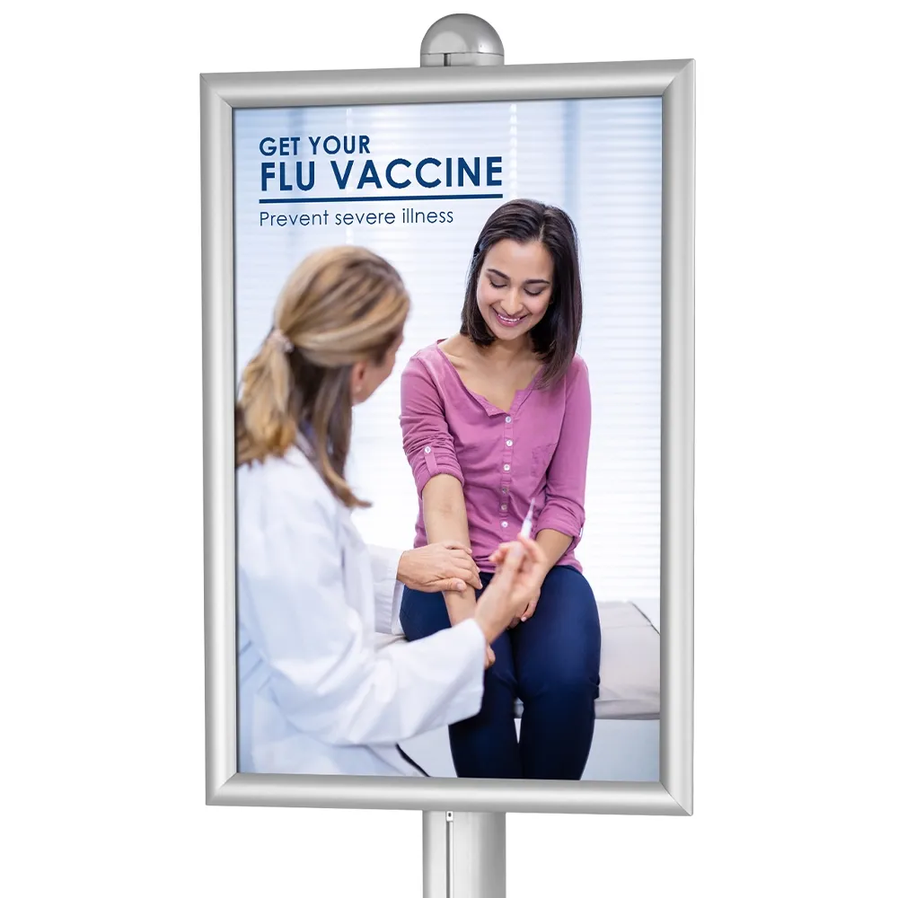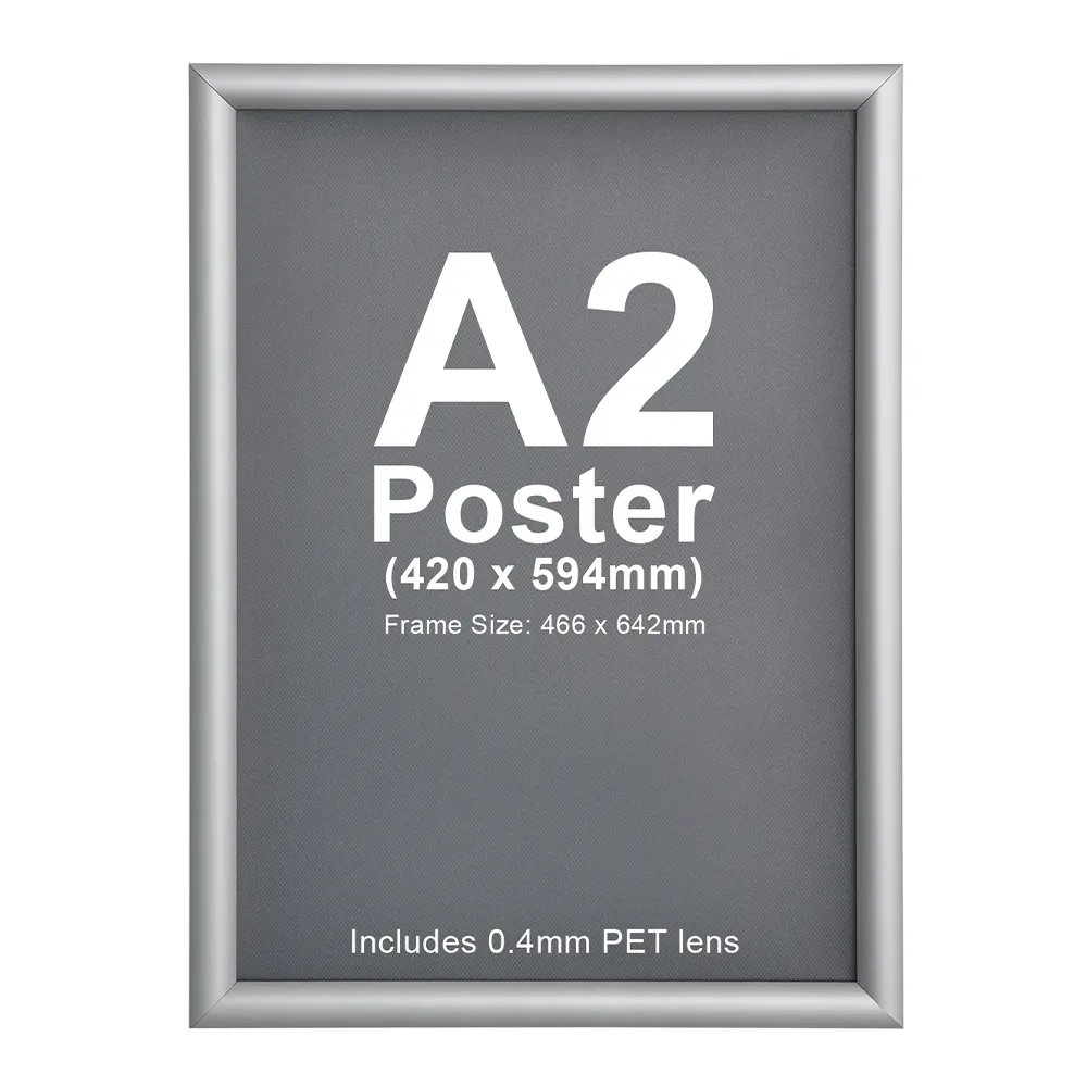 An A2 poster frame or snap frame is a versatile element of our modular Sages Display System. They are a neat and tidy way to get your message across without overshadowing your promotional displays. Finished in silver anodized aluminium and weighing in at only 1.5 kg means that as well as being stylish and refined our A2 snap frame is also light and easy to assemble.