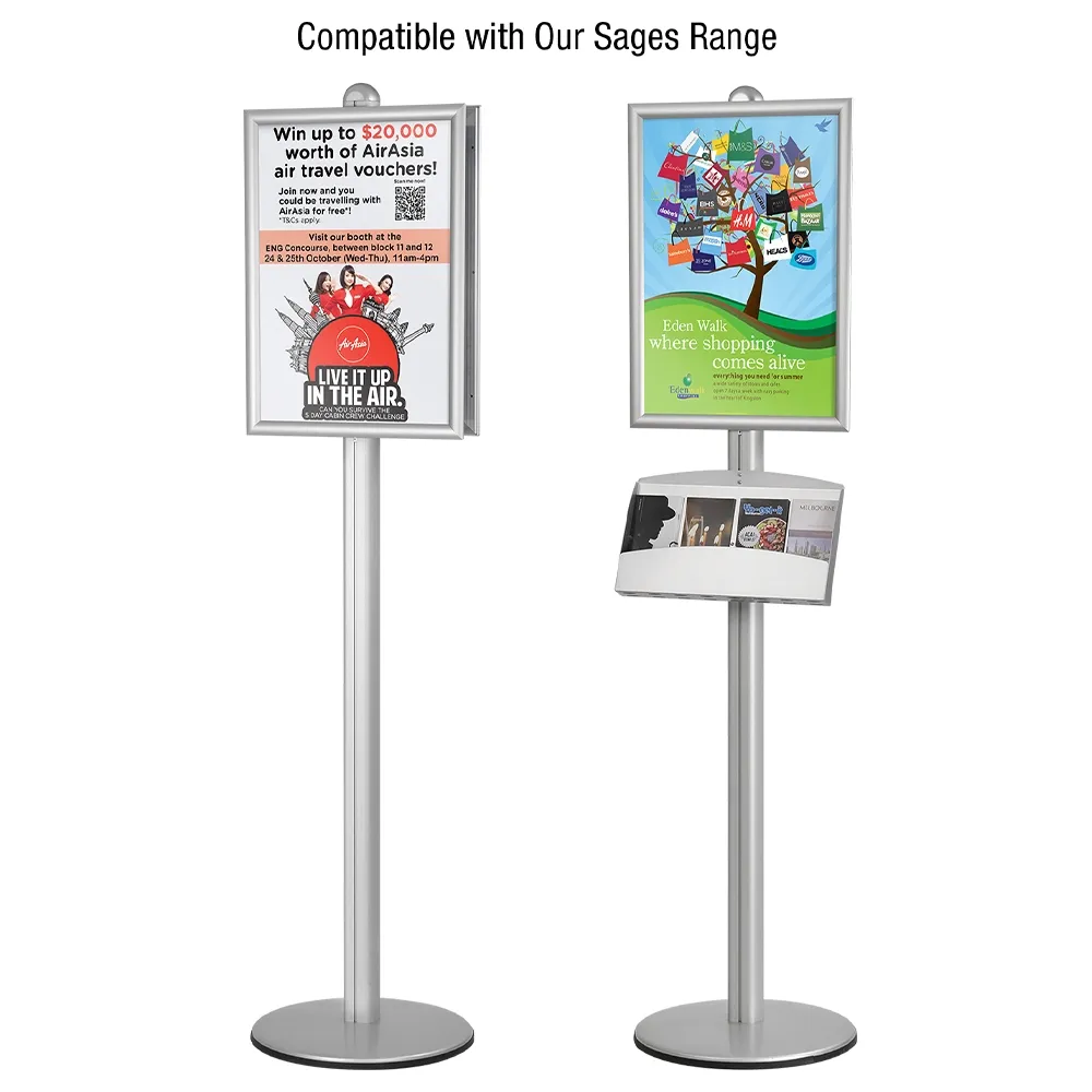 The Sages Series is a modular system that can be used with a wide range of other accessories such as: assorted poster sizes, brochure holders, printed banners and shelving configurations. The European styled stand can be easily manoeuvred around you premises to suit your needs and the range of accessories available provides versatile presentation of your graphics and advertising material.
