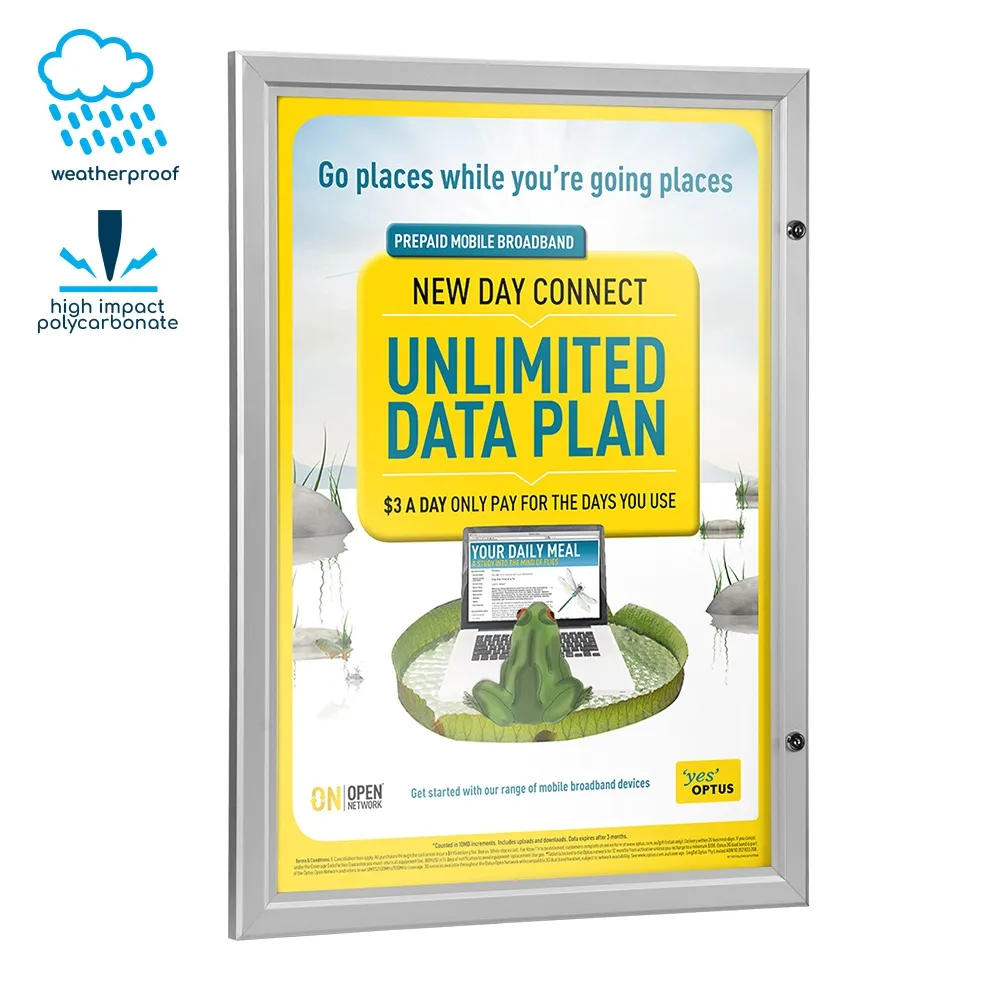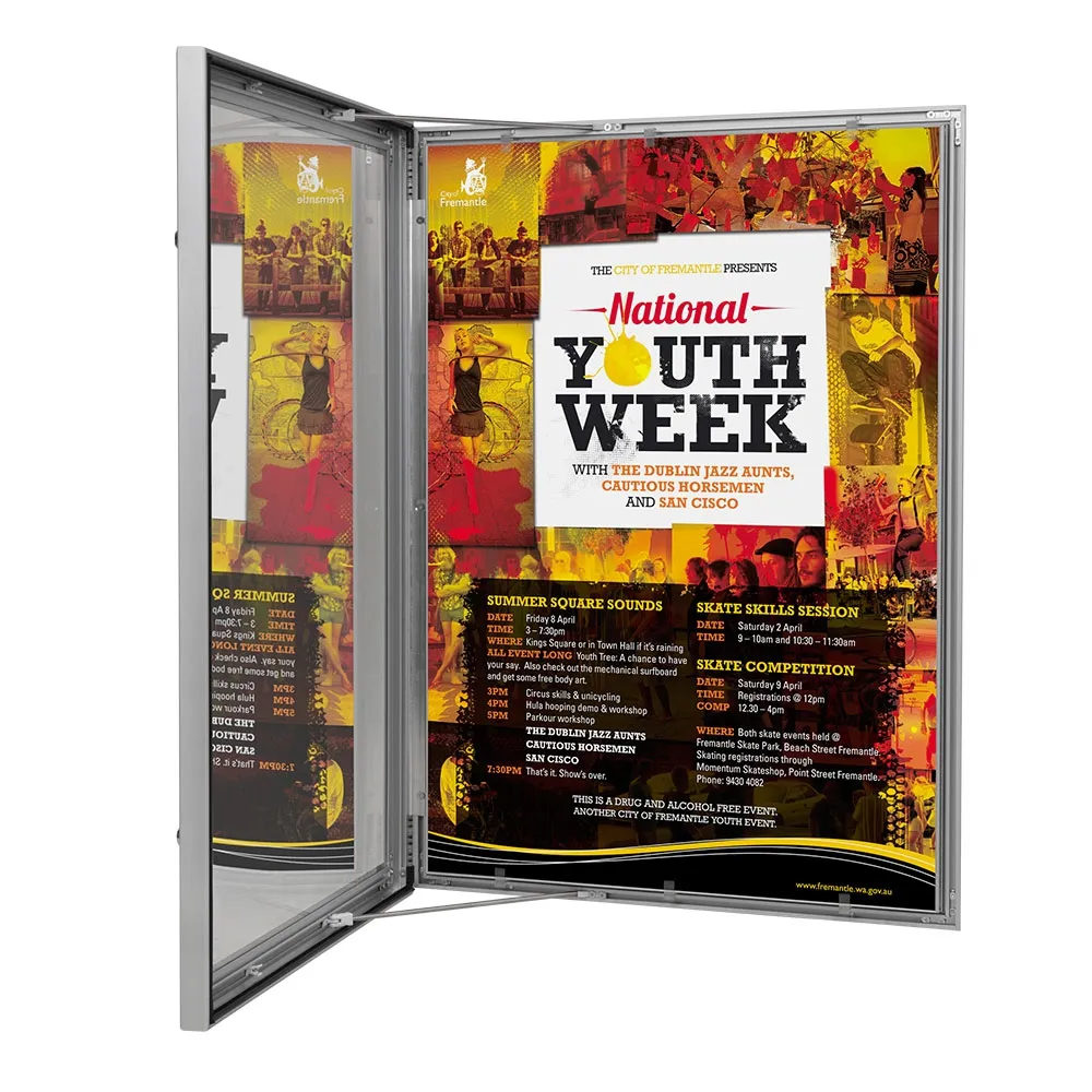 The beauty of these wall mounted sign frames is their suitability to so many marketing, advertising and branding applications. They’re perfect for menus, directories or any type of exterior poster display in which security may be an issue. Being lockable and weatherproof, you can fasten them to the front of your premises and get your marketing message out to the public without worrying about vandalism or deterioration of your poster.