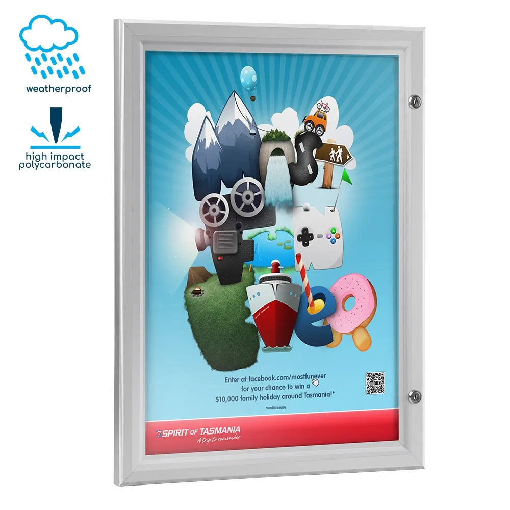 The beauty of these wall mounted sign frames is their suitability to so many marketing, advertising and branding applications. They’re perfect for menus, directories or any type of exterior poster display in which security may be an issue. Being lockable and weatherproof, you can fasten them to the front of your premises and get your marketing message out to the public without worrying about vandalism or deterioration of your poster.