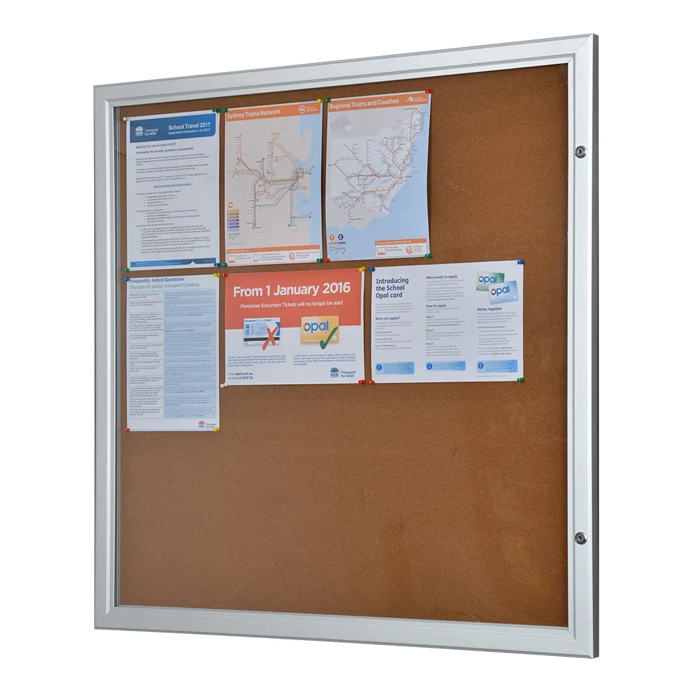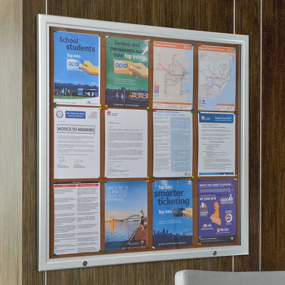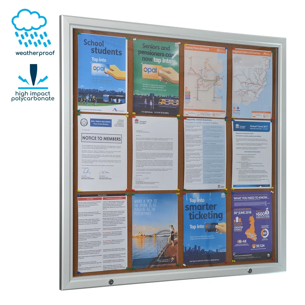 The enclosed bulletin board cabinets, like an aluminium notice board, is designed to be used outdoor with our 100% patented design. There is a rubber gasket around the interior frame to protect water from seeping inside and damaging the corkboard and displayed posters. The above mentioned front lens combines with a aluminium frame that is rust-resistant to ensure protection on the outside. The frame has a silver finish with beveled edges for a stylish look that fits in with shopping centres, schools, retail stores, churches, community centres, cafes, and more!
