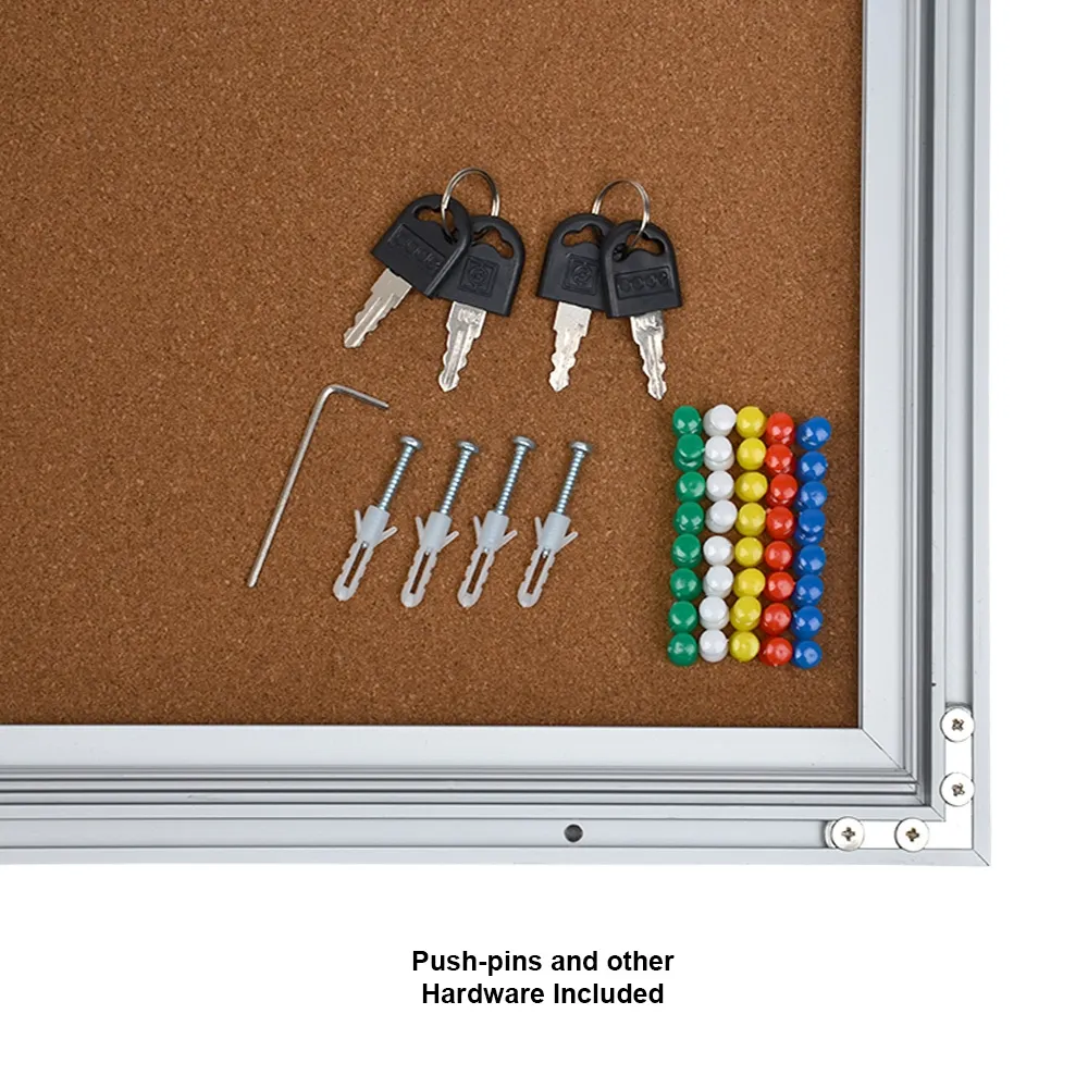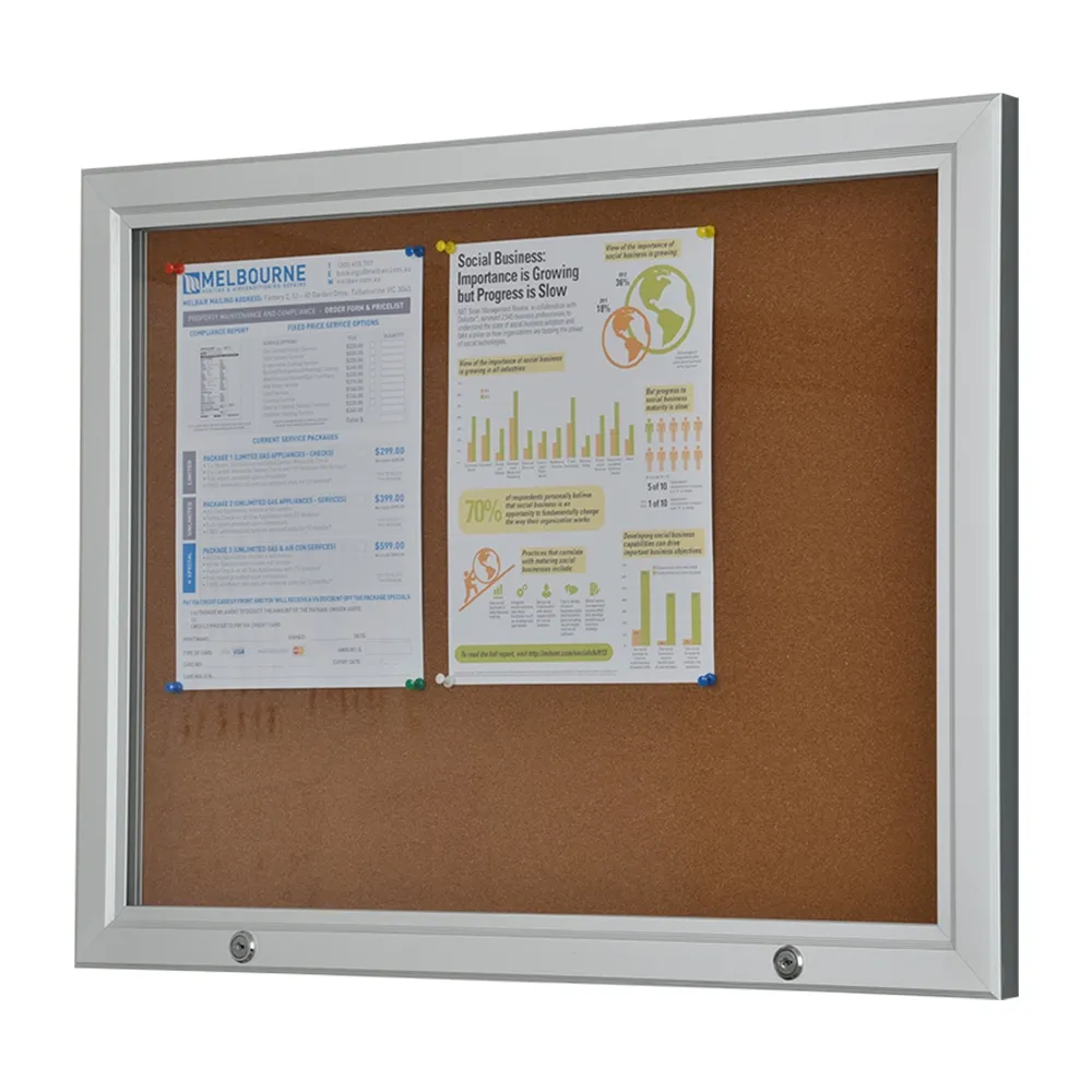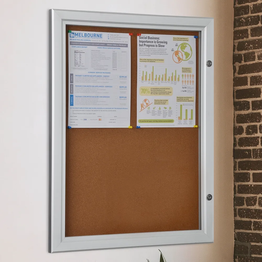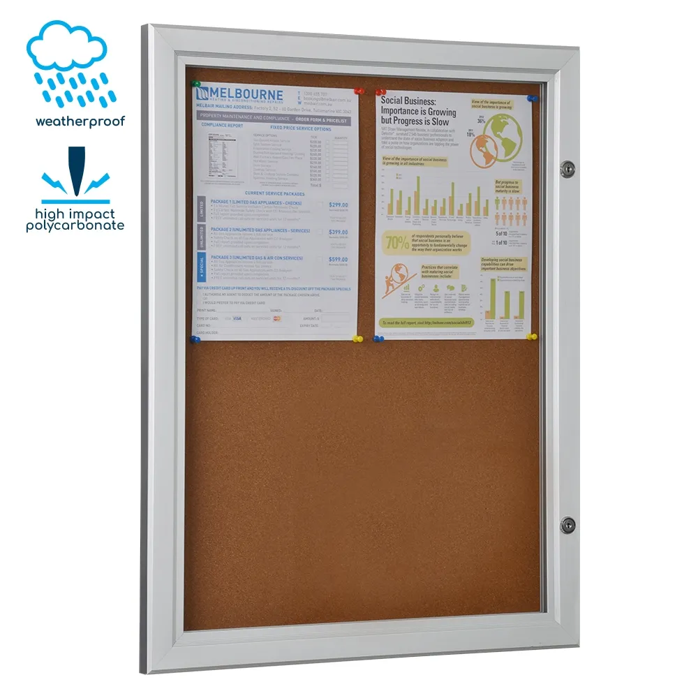 These framed notice boards, like outdoor noticeboards, help you provide valuable information in secure manner. The lockable display features (2) locks to prevent unwanted access to the interior of the display and ensure only keyholders can change out posters. Changing out poster is fast and easy once unlocked, as the swing door features struts to prop the door open. The self healing corkboard provides years of continuous use, and has a 468 x 644mm visible area that can display up to 4 x A4 (210 x 297mm) posters.