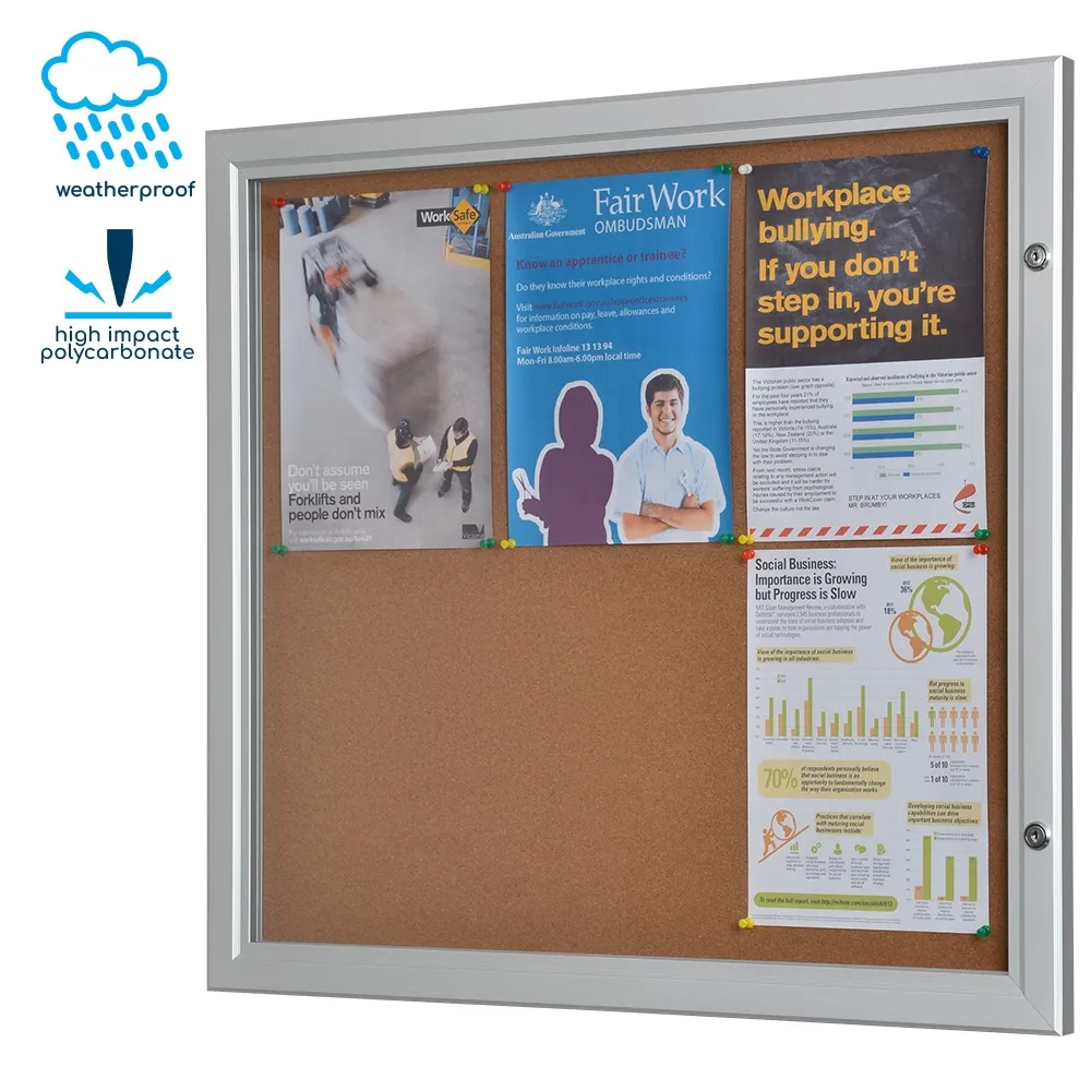The outdoor bulletin boards, enclosed cork boards is designed for use outdoors, with our 100% patented design featuring a rubber gasket that prevents water from seeping inside and damaging the displayed posters and notice board. The frame itself is made from rust-resistant aluminium with a silver finish, which combines with the beveled edges to offer a stylish look that works in any environment. The self-healing corkboard can be used continuously with push-pins, tacks, or staples and has a 705 x 644mm visible area for placing up to 6 x A4 (210 x 297mm) posters!