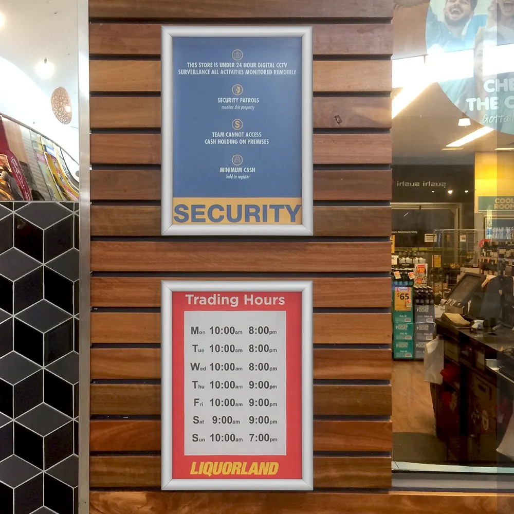 These clip frames or sign frames can be used for places such as shopping malls, exhibitions or banks. Constructed using extruded aluminium, the frame is finished in matte silver to compliment your in-store graphics. Mounting hardware is also included with the A3 snap frame; the frame itself has been prepared with mounting holes for your convenience. The uses for these clip frames are endless and they can be easily updated as they are constructed with a snap frame.