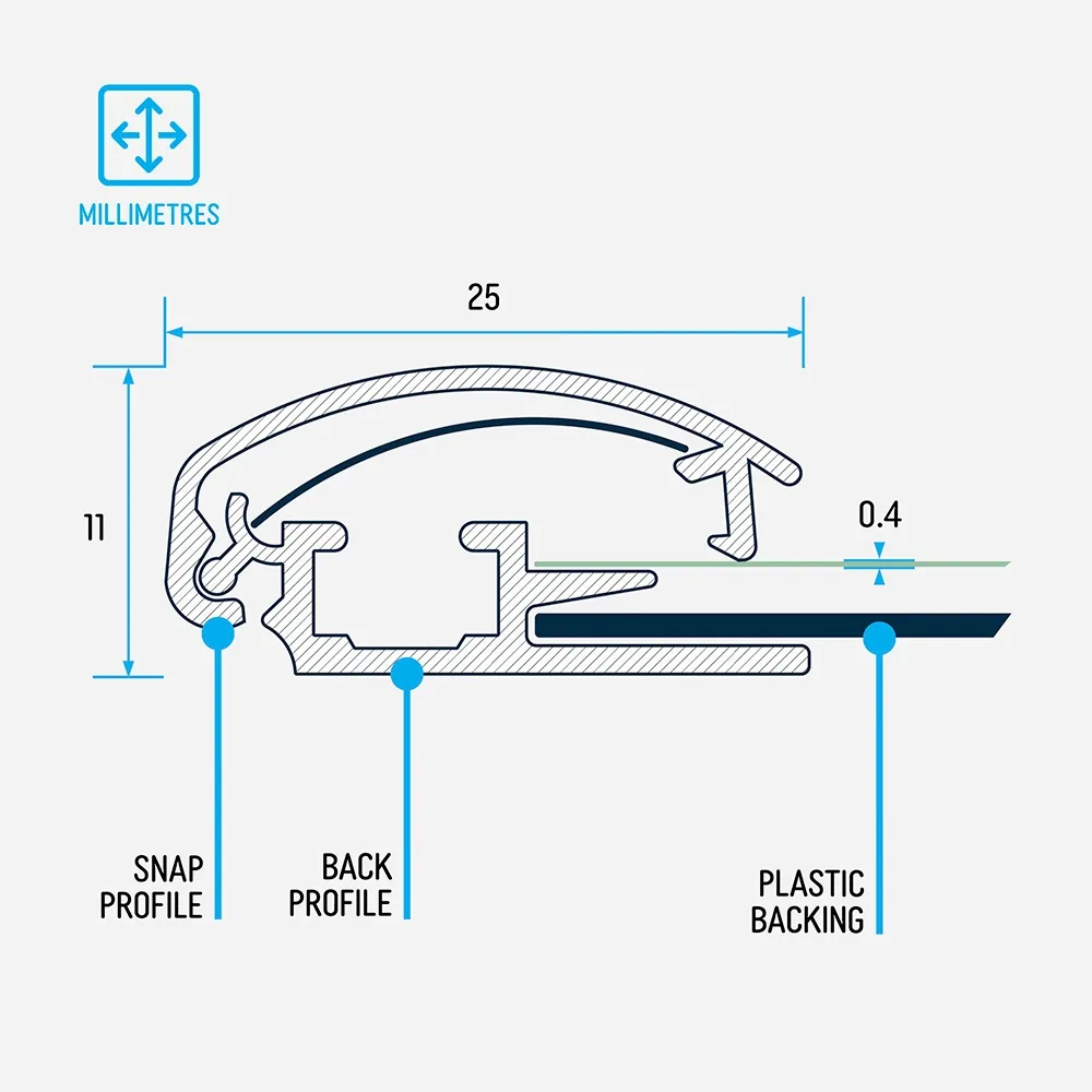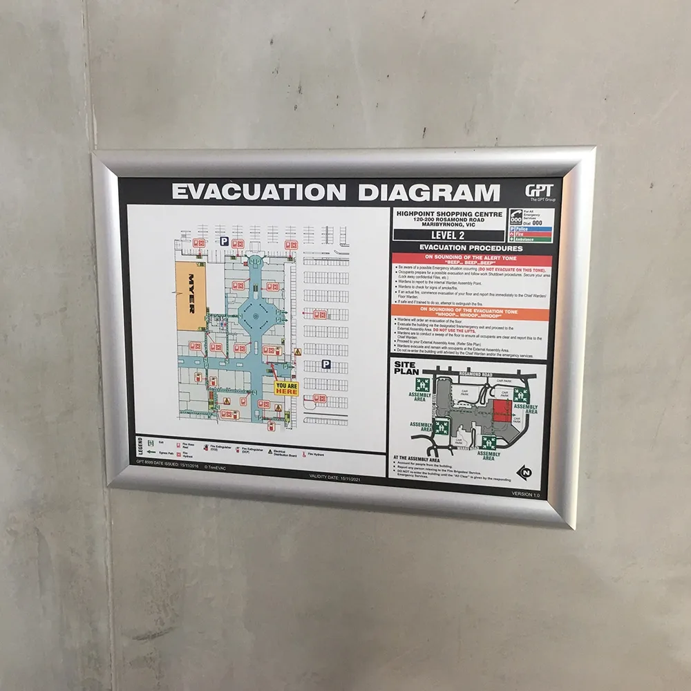 The snap frame’s artwork can be easily changed by simply lifting the frame sides. Artwork sits behind the protective plastic lens which is included to not only protect the artwork, but to also stop light reflecting off your artwork. Your frame can be mounted onto flat surfaces and be displayed as either landscape or portrait. More clip frame sizes include A0, A1, A2, A4 & we also stock a larger 1700 x 600mm, 870 x 327 mm size. As the snap frame is finished in matte silver, the sign frame will suit many of your advertisements and promotional signs. All our clip frames are individually packed to avoid any chance of damage during shipment andwe ship sign frames Australia wide.