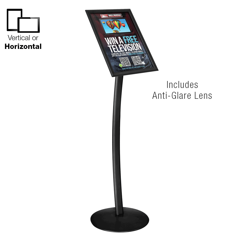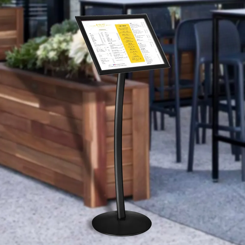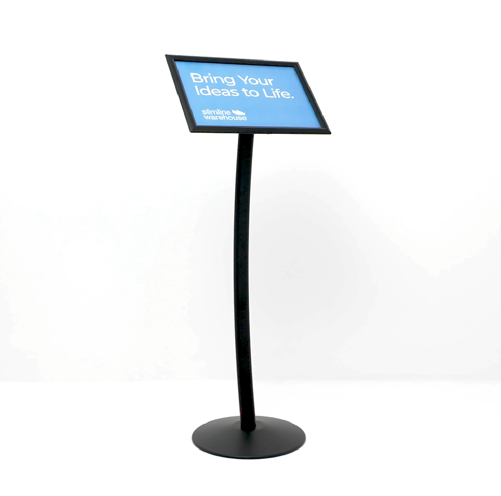 This free standing poster holder, display signage is a professional looking stand that will get the attention of passersby and looks great in a number of different locations. The stand looks just at home in an upscale clothing store as it does outside of a cafe within a shopping centre or at a trade show. The stylish black finish on an aluminium frame ensures compatibility with any décor along with a durable stand that will last for years to come.
