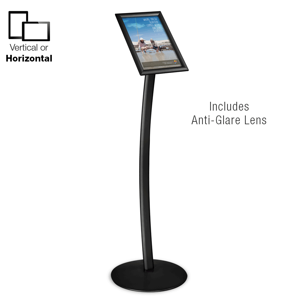 - Promotional poster stand includes anti-glare lens that helps protect posters