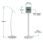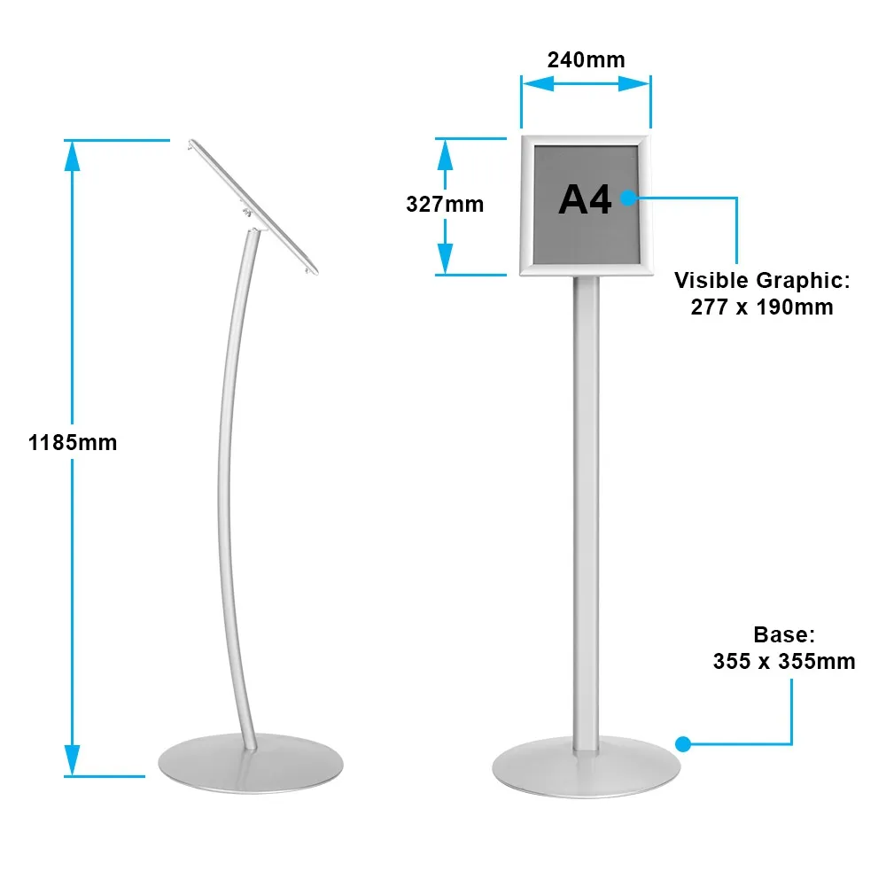 This snap frame pedestal stand is made from aluminium with a silver finish for a durable display that has a professional look that works well with every décor. The floor poster display holds an A4 (297 x 210mm) graphic that is in portrait or landscape orientation for versatility. Switching the format is easy using the thumb screw or butterfly nut on the back of the frame. Keeping the graphic clean is easy as well, as the anti-glare lens keeps grime and dust from gathering whilst helping patrons to easily read advertising signs.