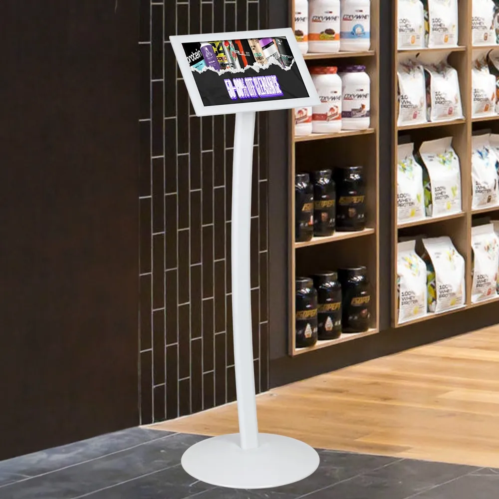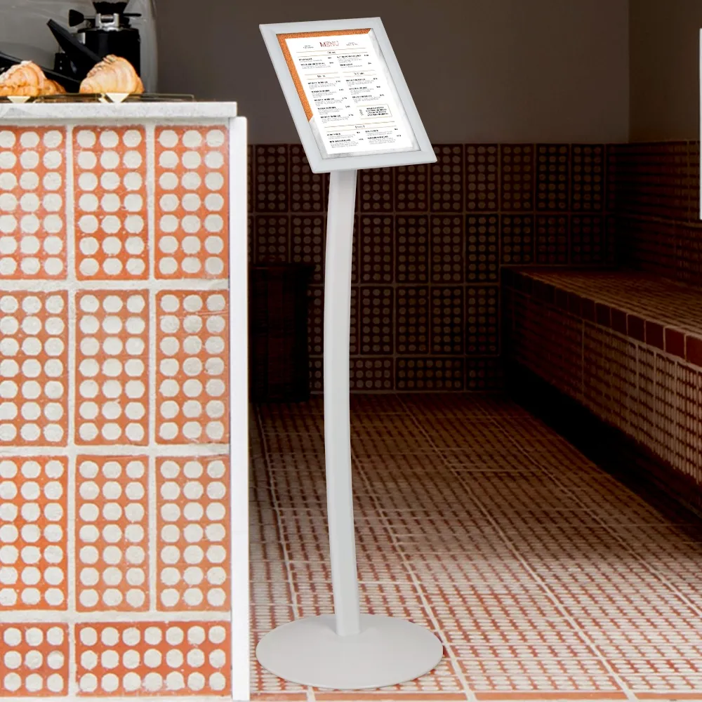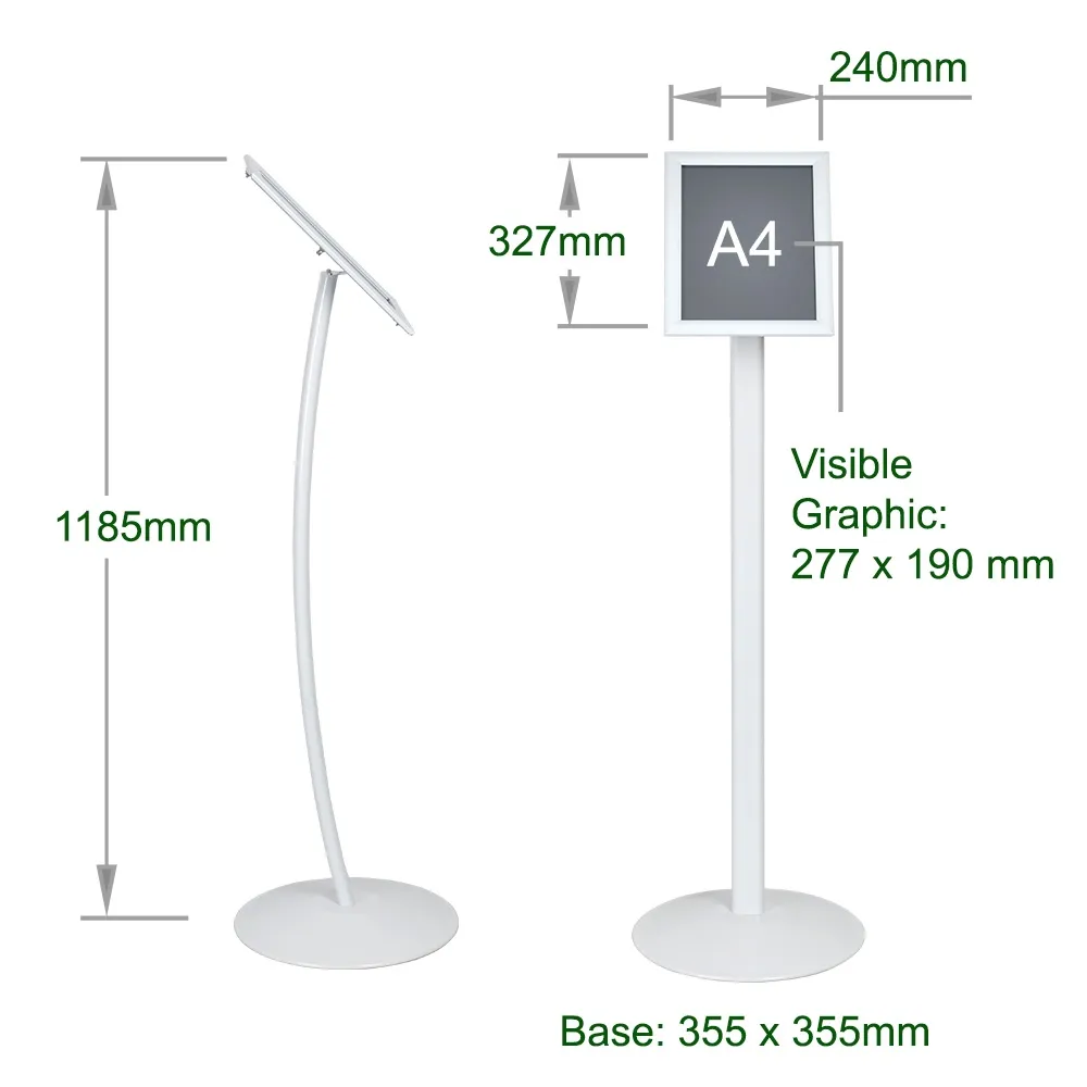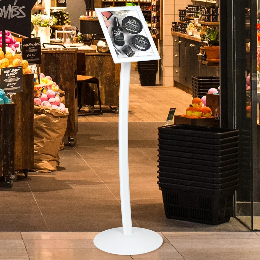 This curved sign holder, like many of our poster stand, can be used in both portrait or landscape orientation for added versatility. Made from durable steel, this stand is sturdy but also lightweight to allow you to move your display as required with ease. The sleek white design fits easily into many décor settings for any businesses such as at cafe entrances, shopping centre aisles, office lobbies, libraries, and more.