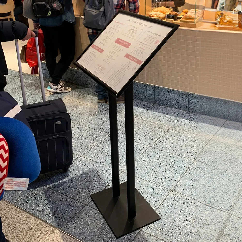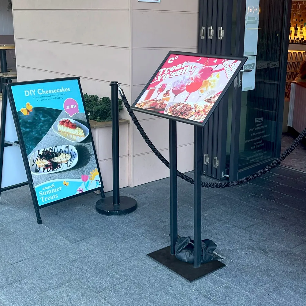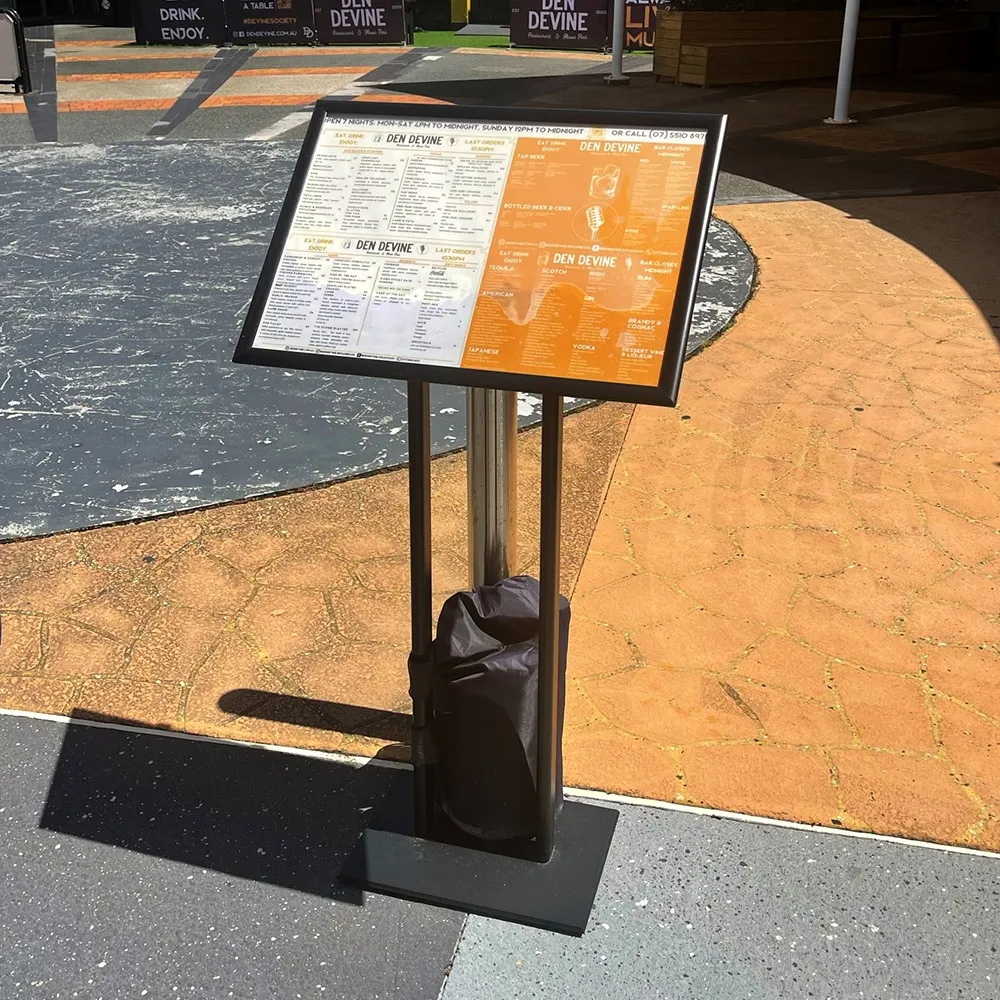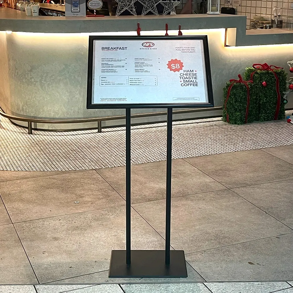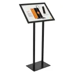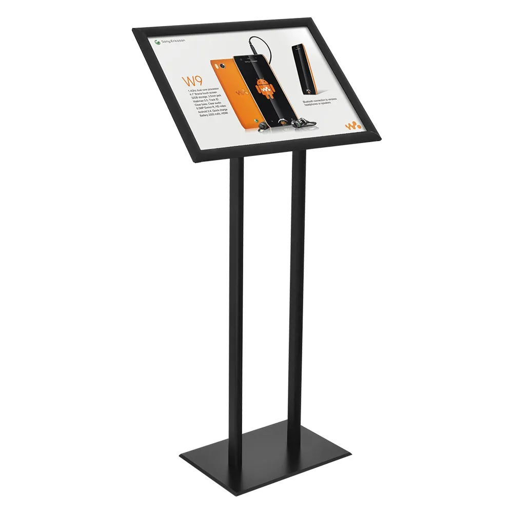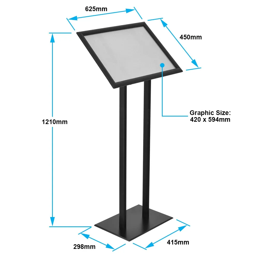 These advertising stands are made from aluminium for durability, designed to be used in heavily-trafficked areas without a problem. The black finish, coupled with the two column design, adds a stylish European look that works as well in a news agent in a bus station as it does in an upscale shop. The base of the stand is weighted to ensure stability during use. The floor poster display is 1210mm tall, a perfect height for any passersby to read what your custom graphic shows. The sign frame is angled to make reading easy for any visitor.s