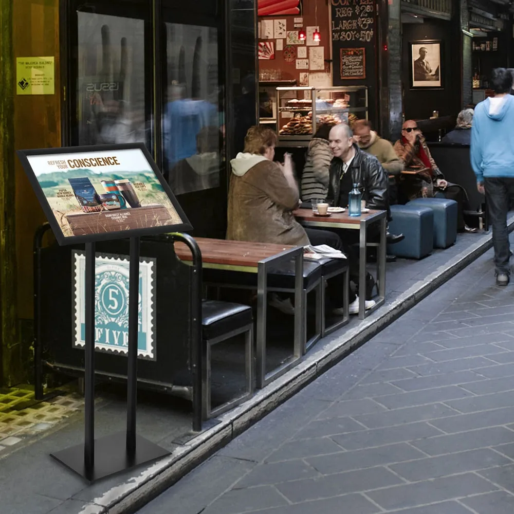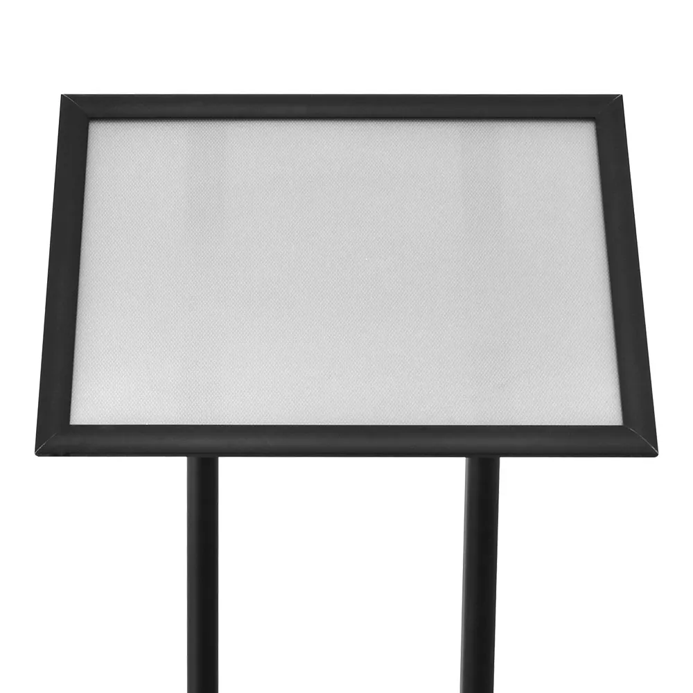 These retail poster stands, advertising stands are a great way to show different information to customers. The sign frame displays an A2 (420 x 594mm) graphic in landscape orietnation, and is perfect for menus, directories, and pricing information or product specification. The snap frame makes graphic changes easy, without any tools necessary for quick switches. Simply snap open the four sides, remove the lens, change the graphic, and snap back shut! The included lens helps maintain a professional appearance by preventing grime or dust from gathering during use.