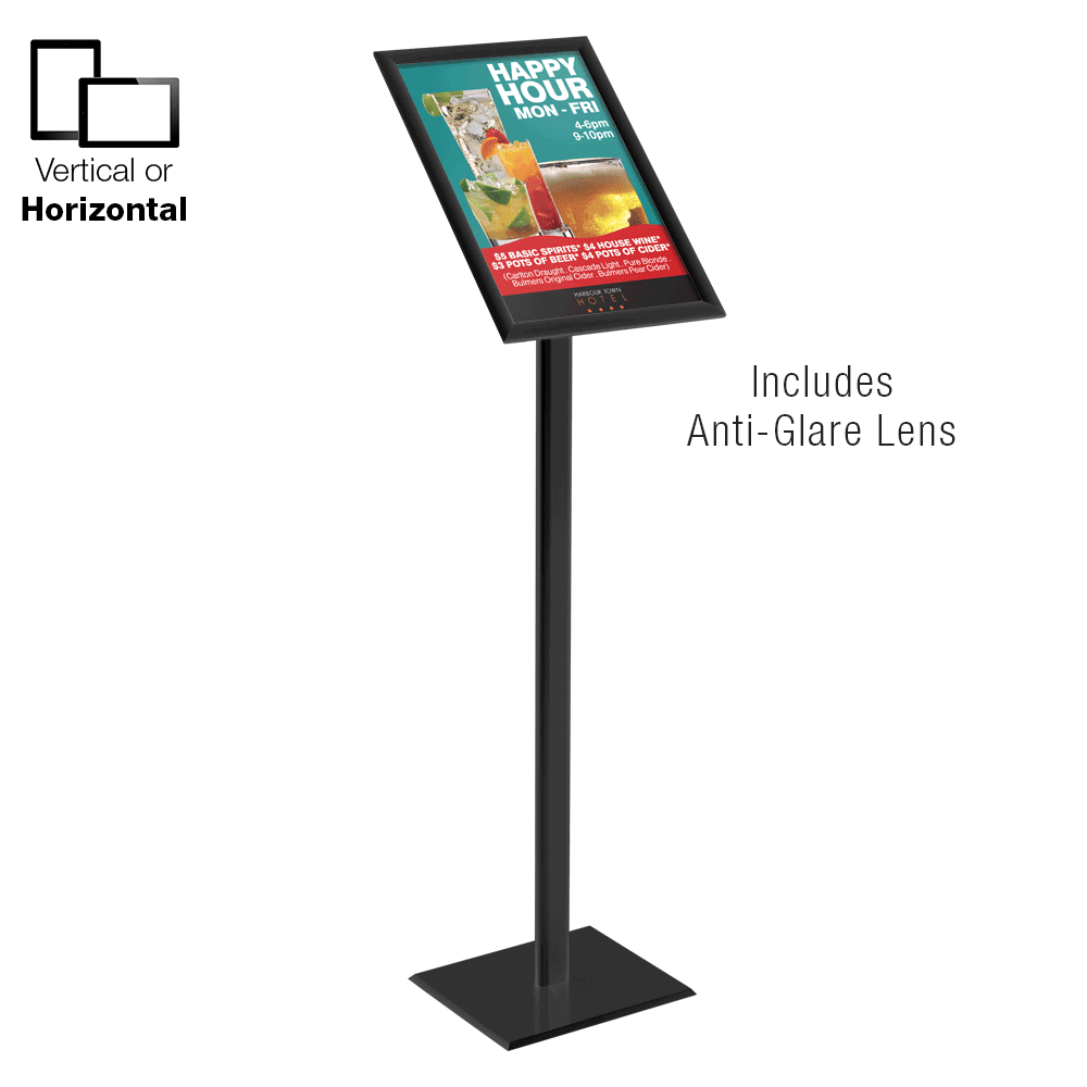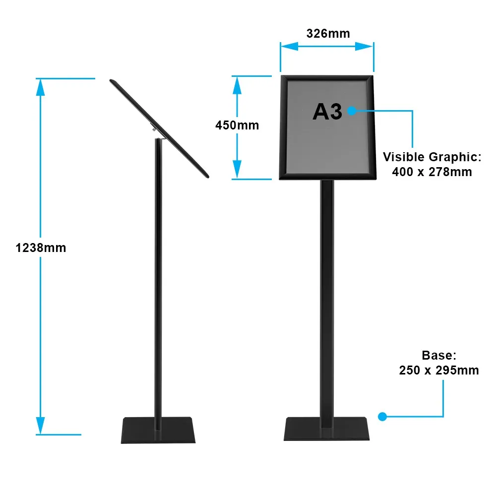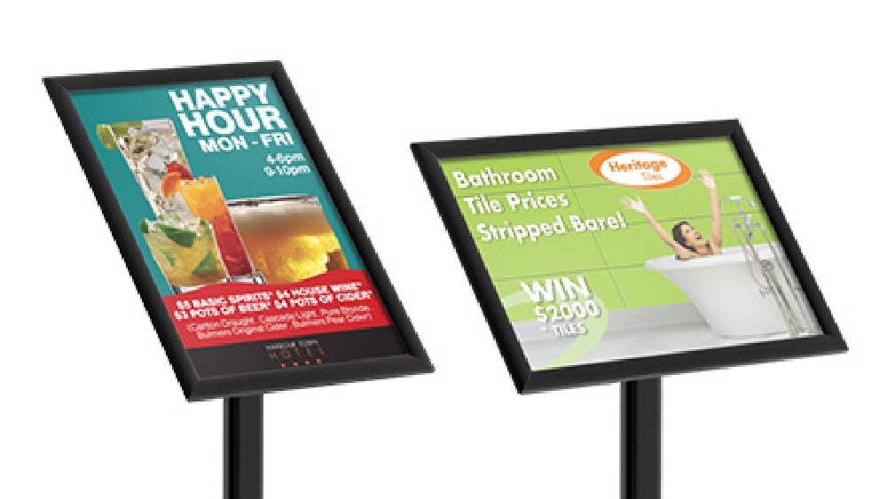 The floor poster holder, snap frame stand is designed to hold an A3 (420 x 297mm) graphic in either portrait or landscape orientation. The versatile display can easily be changed between the two formats without any tools. Speaking of no tools, changing out graphics using the snapper frame is quick and easy without any tools necessary. Simply unsnap the four side, remove the anti-glare lens and replace the poster, and snap back closed!