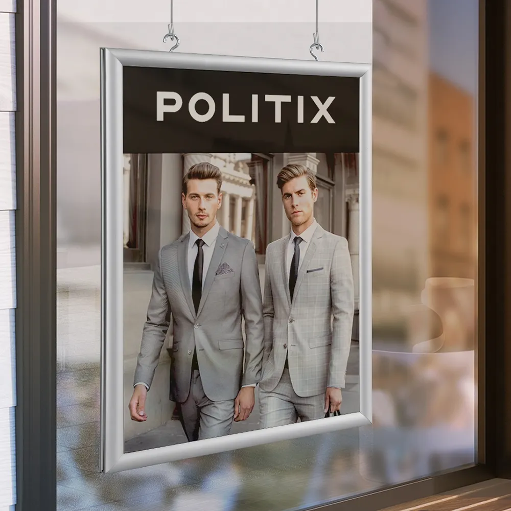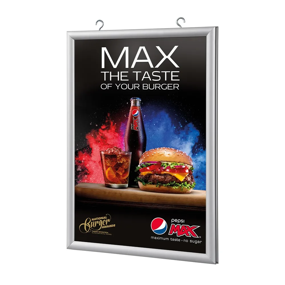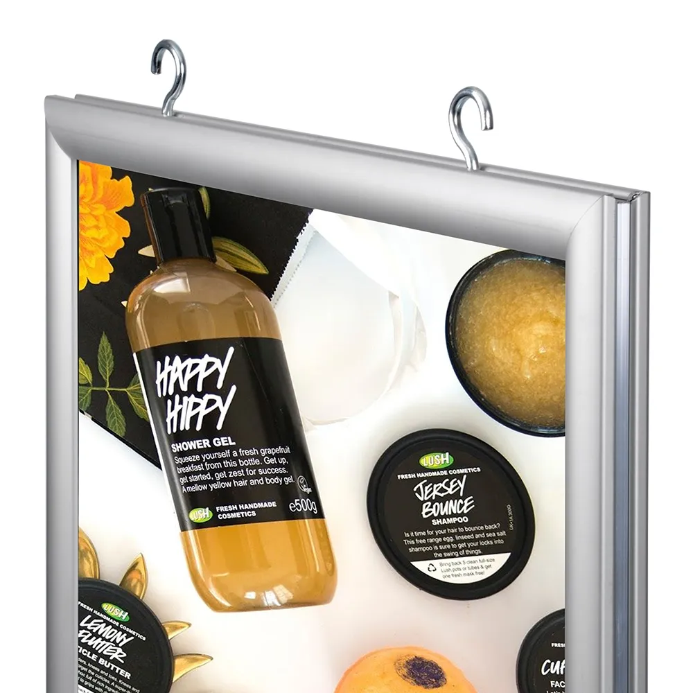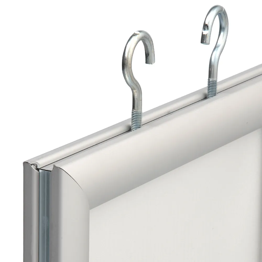 These clip frames display two A2 size posters and can be suspended from the ceiling in retail shops, cafes or real estate offices. Included are eyelets for hanging. Hanging cables and other hardware can be also purchased separately for your clip frame display. This snap frame is easy to use and has been manufactured using quality extruded aluminium. Clear plastic lenses are also included to protect your artwork and to give you a professional look to your display.