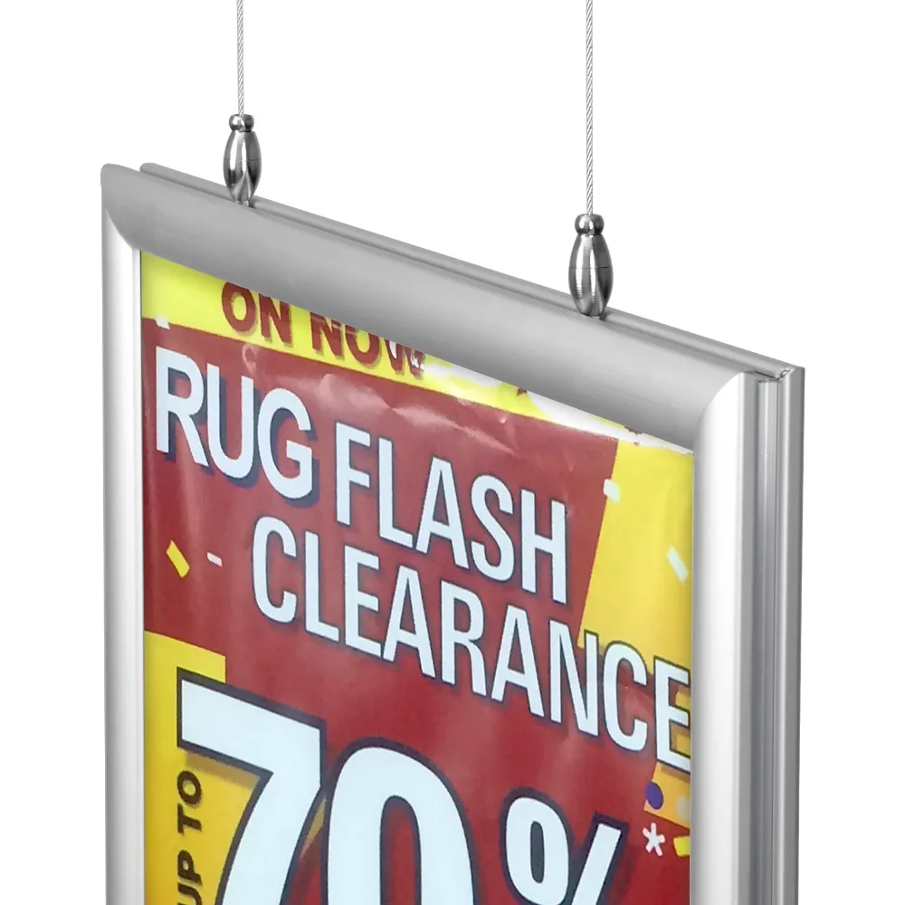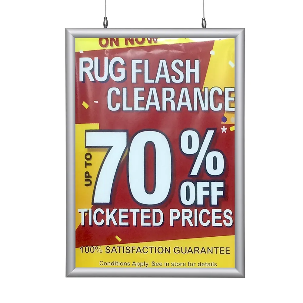 These clip frames are designed to be suspended from ceilings and are ideal for shop front windows. Stainless steel cables and hardware are included to hang your clip frame. Also included are clear lenses to protect your advertisements. The A2 sign frame works as a clip frame making it easy to replace or update your posters. Being double sided will draw people from both sides of the hanging clip frames and they work well in busy places such as real estate offices, banks or cafes.