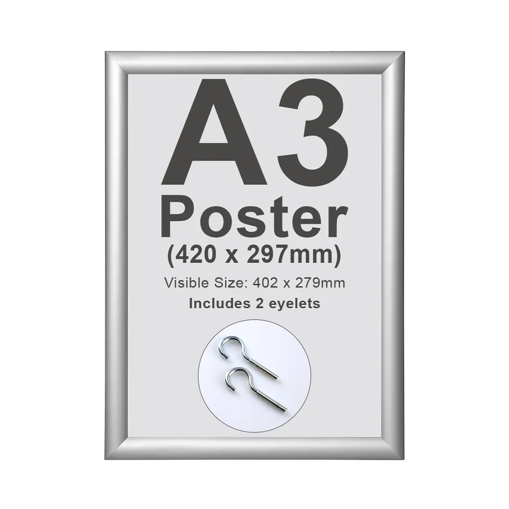Use sign frames around your restaurant, real estate office or bank for a professional poster display. These sign frames can be hung from the ceiling and are ideal for shop window displays. The easy to use snap frames are catered for busy environments where posters are frequently updated. The A3 sign frames are supplied with clear lenses and eyelets to enable you to hang your portrait sign frames. Additionally, other hanging hardware & cables can also be purchased separately to hang your clip frame.