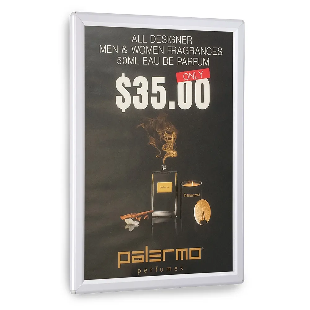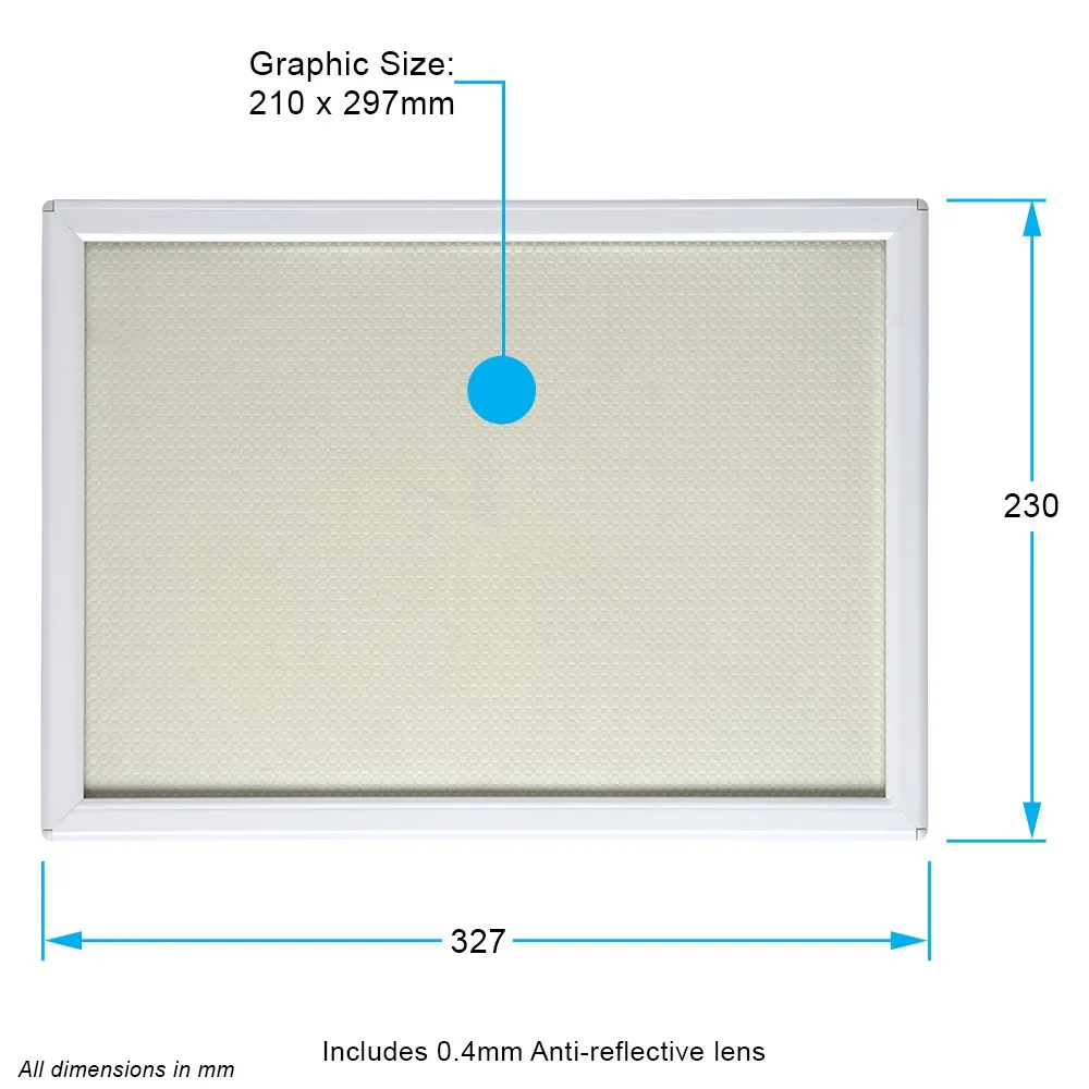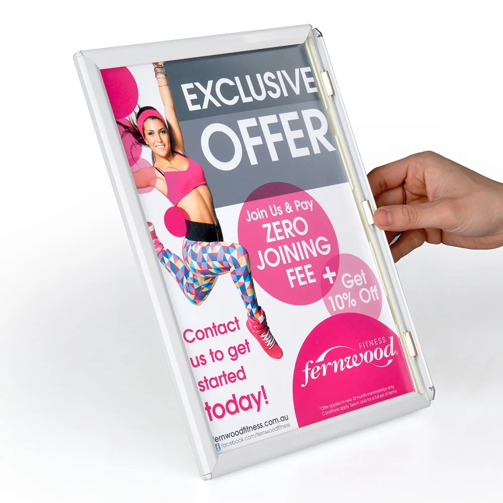 Use an A4 white frame to showcase advertisements and menus at your location! The snap frame makes it easy to change out graphics whilst mounted on your wall without any tools needed. Open the four sides of the frame, take out the lens and graphic, replace the poster and put the lens and poster back inside! Snap the four sides shut and you're frame is ready, all in less than a minute!