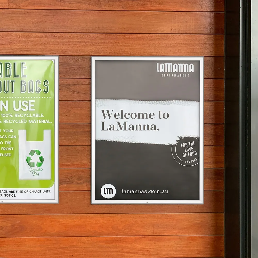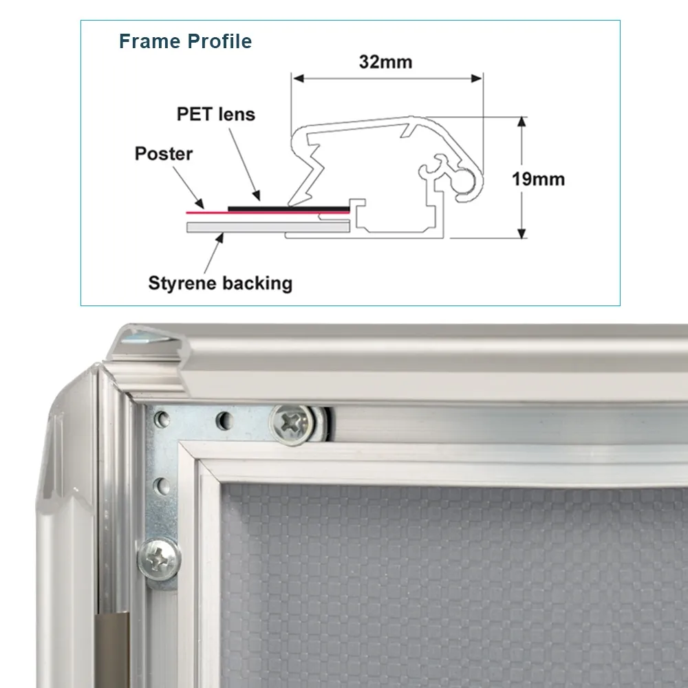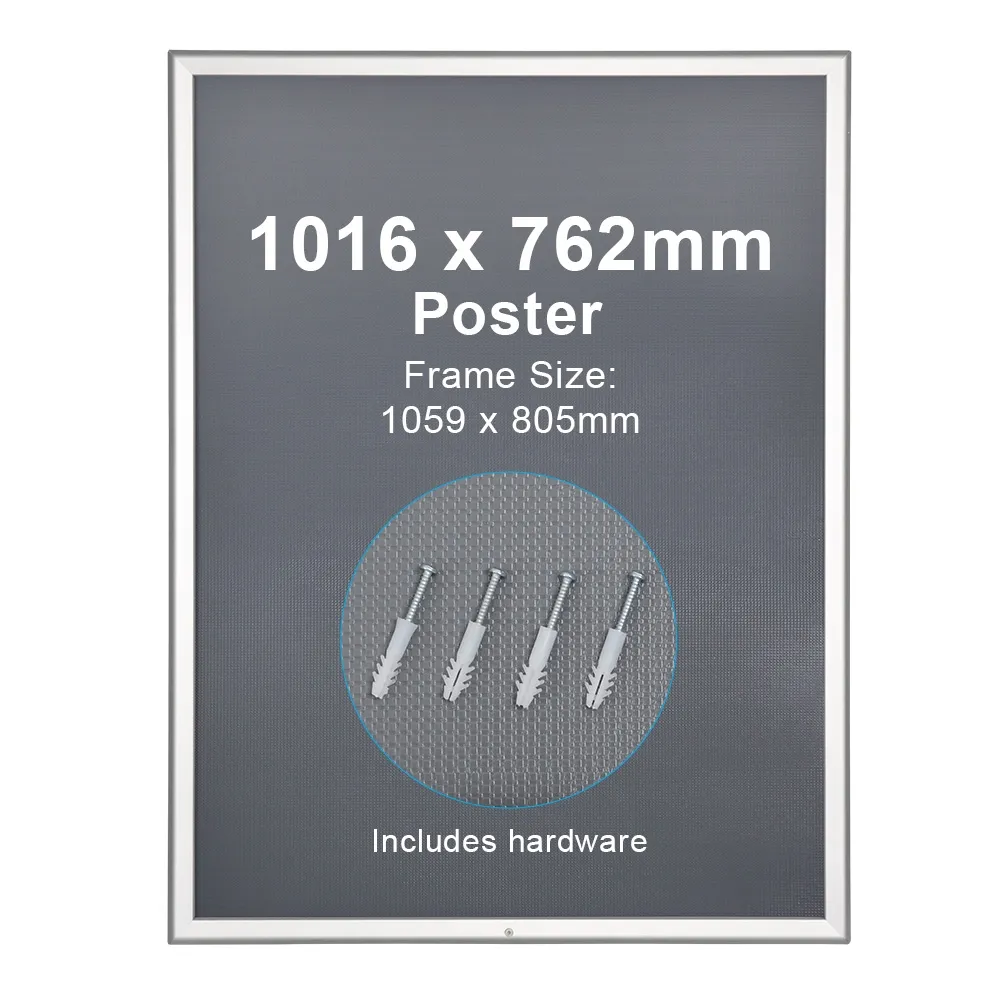 This 30 x 40” clip frame, or snap frame is designed to be installed in public spaces. It features a lock that is activated using a 3mm allen key and locks all four sides of the frame thus stopping vandals or thieves accessing the poster or advertising on display. This makes it ideal for such venues as shopping centres, train stations, bus terminals and movie cinemas.