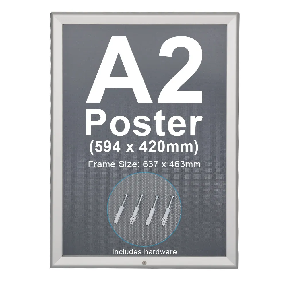 Use sign frames or snap frames as part of your marketing within your premises today. This snap frame is lockable and can hold a single sided A2 poster. Included with the unit is an allen key for locking, a protective clear lens and mounting hardware. These snap frames can be displayed in either landscape or portrait format giving you more flexibility when displaying your sign frame. The extruded aluminium frame is created with the snap frame system which makes it easy to update your artwork at any time. We also stock these snap frames in other sizes including A0, A1, A3 & A4.