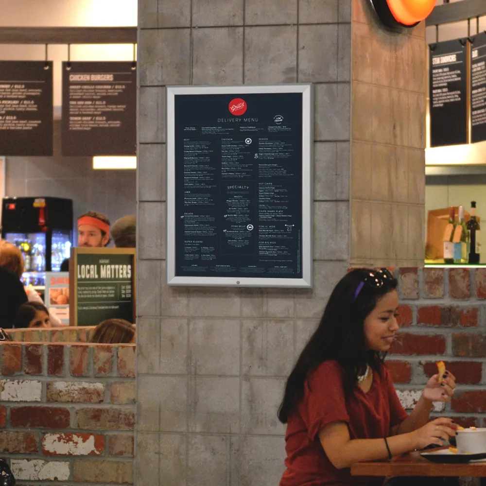 Our snap frames have been created to make usability easy and simple. These sign frame have been designed with a snap frame system. Simply by unlocking the unit and lifiting the sides of the frame allows you to position artwork into the frame. Then you can just snap the sides of the frame down onto your artwork. In minutes, update A2 posters in your sign frame. These frames also have wall mounting hardware included to have you displaying the sign frame anywhere in your store. This is especially handy for places such as banks, department stores or food outlets.