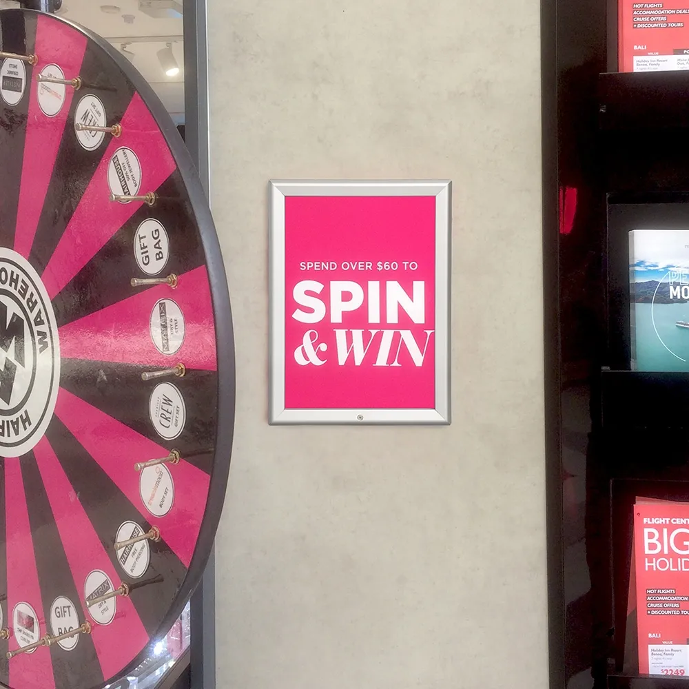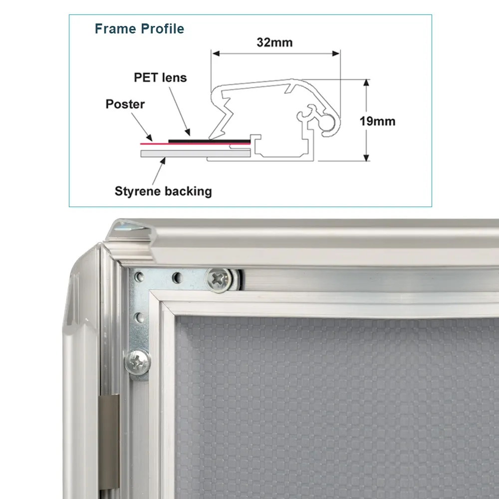 Your snap frame can hold A3 posters and will be presented in this sleek silver poster holder. These sign frames are easy to use as they have been designed with a snap frame system. By unlocking the snap frame with the allen key provided, you can then lift up the sides of the frame- then you can insert you poster with the protective lens before securing the poster by snapping down the frame. Simple to use, these sign frames will find their way into places such as pharmacies, retail shops or cafes where promotions are constantly changing and need updating.