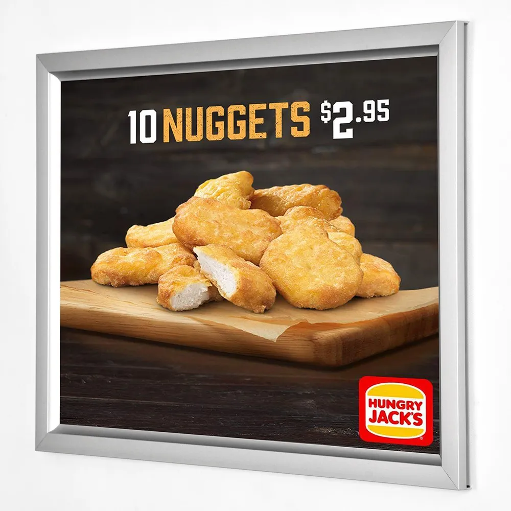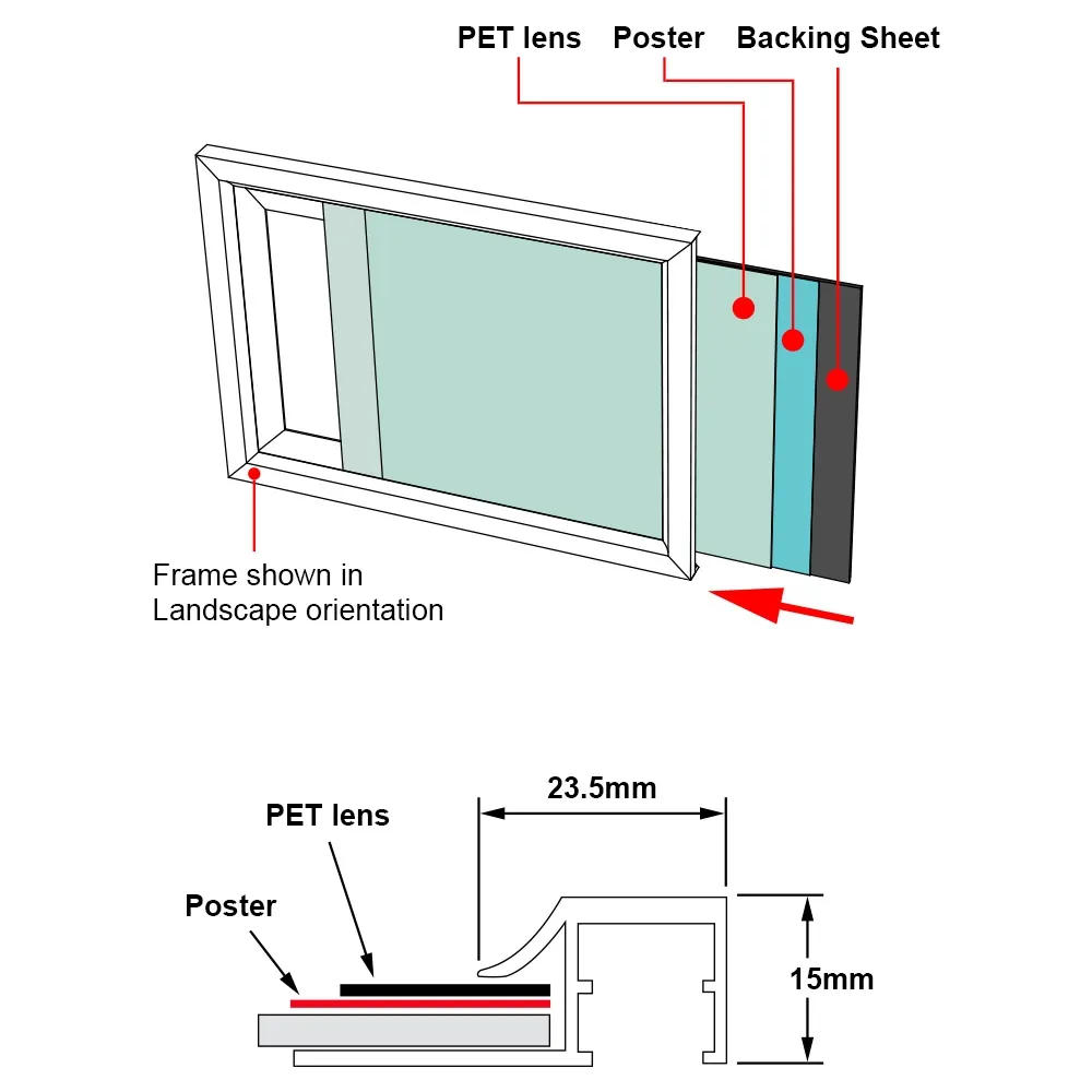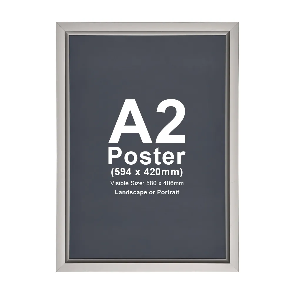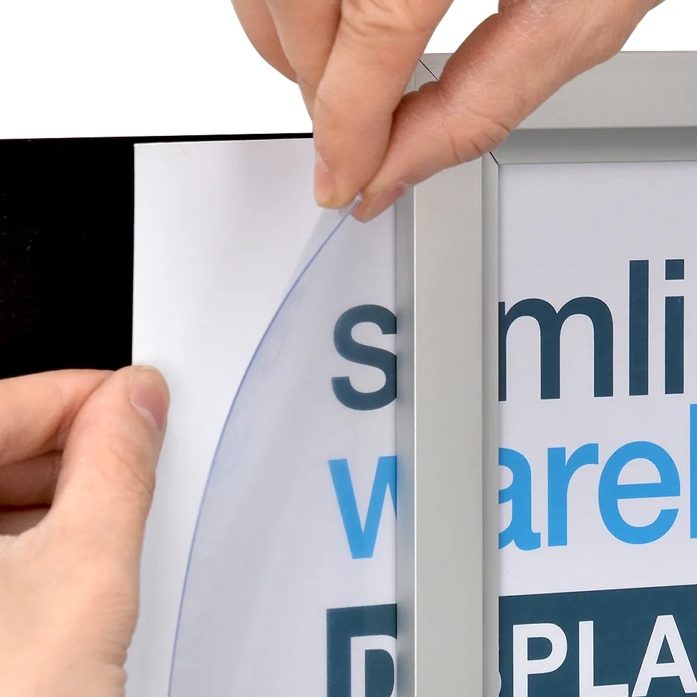 These A2 poster frames feature a slot in the top of the frame into which you simply slide your poster, ensuring that graphics changes are as quick and easy as possible. Each poster is then displayed behind a clear plastic lens which minimises the reflections that occur in bright retail environments, as well as protecting posters from both natural and artificial light.