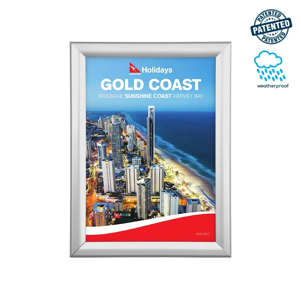 This waterproof clip frame, snap lock poster frame is an outdoor snapframe that displays your poster without letting it be damaged by the elements! The clipframe uses a 100% patented rubber gasket to form a tight seal between the snapper frame and the included protective lens, effectively keeping water from seeping inside. The PET clear lens also offers UV protection, preventing posters from fading from sun exposure. These features make this holder ideal for use outside of restaurants, shopping centres, transportation hubs, cinema, exhibition halls, and more!