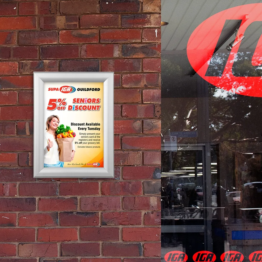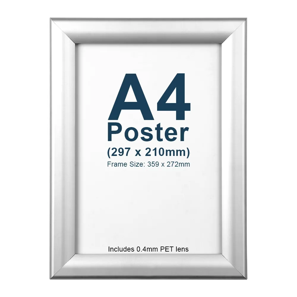 The A4 snapper frame, front loading frame is made from anodised aluminium that is rust and corrosion resistant. The silver frame makes poster changes quick and easy without any tools necessary thanks to the clipframe design. The poster holder display an A4 (210 x 297mm) poster in portrait or landscape orientation depending on how you have the display installed. The back of the frame utilises a styrene backer board that helps sandwich the poster to keep it flat and level. A hardware kit is also provided for installation into most wall types, with the screw heads being hidden within the frame for a professional look. Order by 3pm EST to receive same day despatch Australia-wide when in stock!