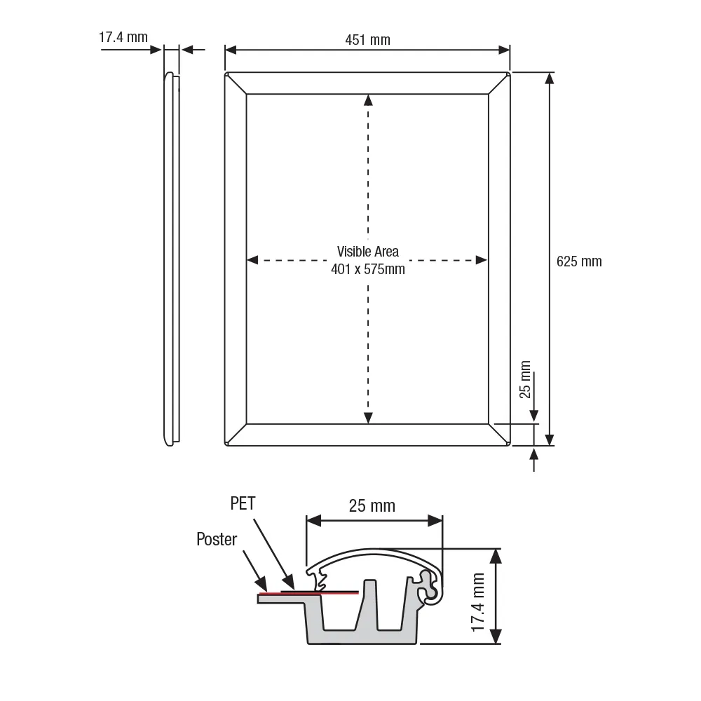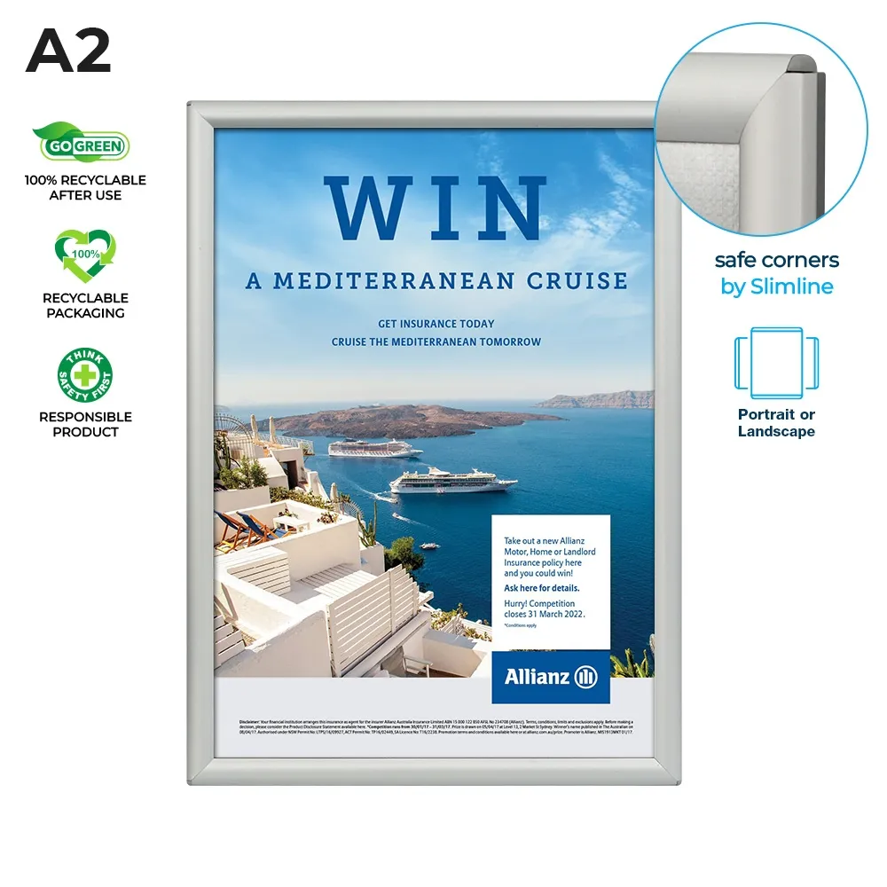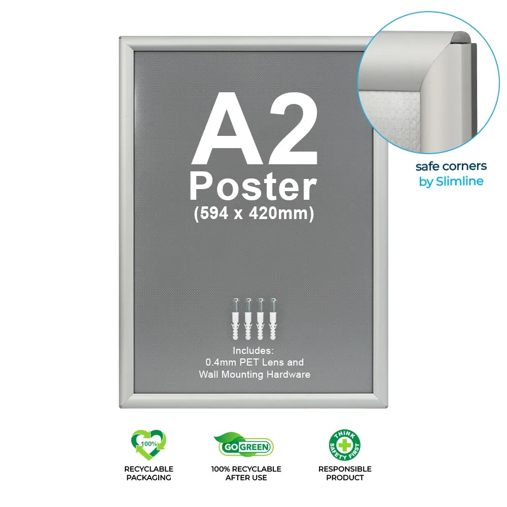 This poster snap frame, like a clip frame poster holder, is designed to hold A2 (420 x 594mm) standard size signage in either portrait or landscape orientation. The frame features a slim profile, protruding out from the wall only 17.4mm. The rear of the holder is made from injection moulded plastic to provide a flat surface that your posters rest against whilst inside the display. Use this style of signage holder in your retail store, restaurant, office, airport, shopping centre, exhibition hall, and more for a cost-effective marketing display.