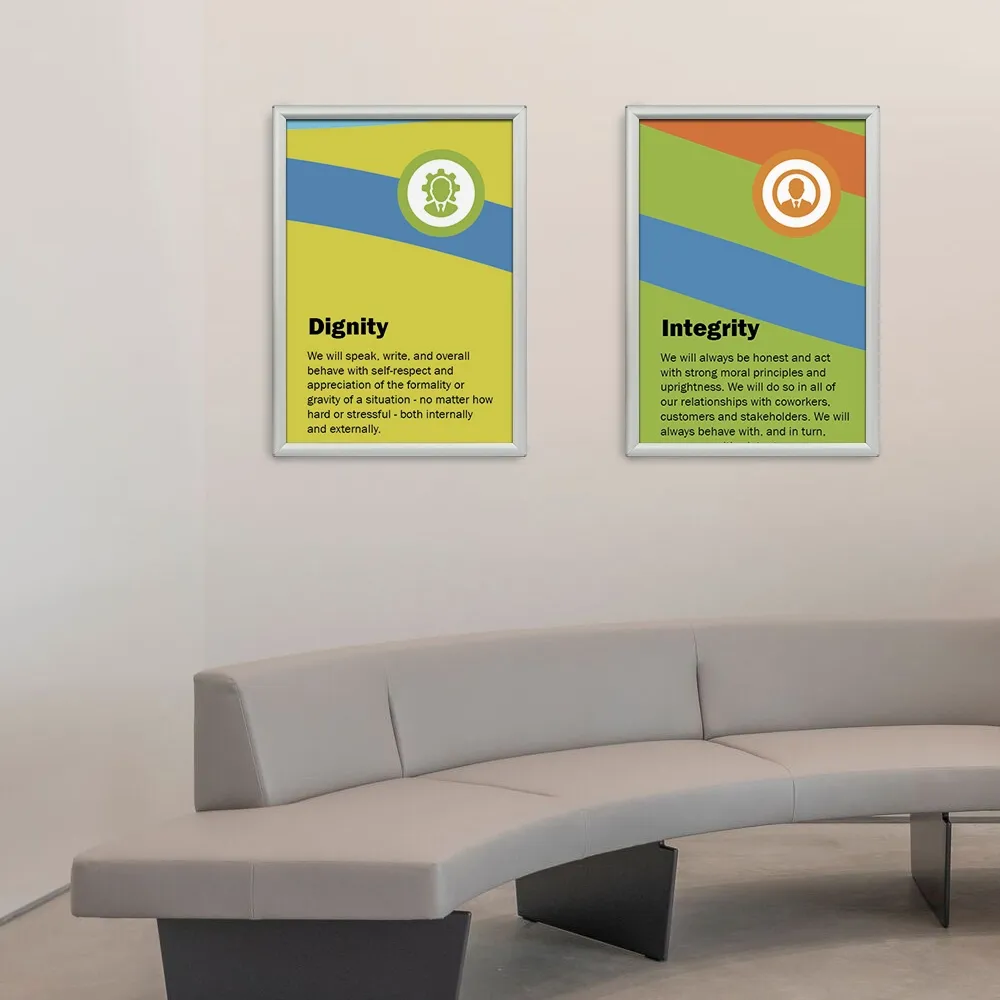 Use this poster snap frame at your location to have signage beautifully displayed and quick to change out without tools or removing the holder from the wall! This clipframe has (4) sides that open to the inside of the holder to allow for graphic change-outs in less than a minute. Just remove the existing poster and protective lens, put in the new graphic and snap all four sides shut! The sides also help to keep the posters in place within the holder. The anti-glare lens is .4mm thick and not only helps with readability in different light, but also prevents grime or dust buildup to make it easier to maintain during use.