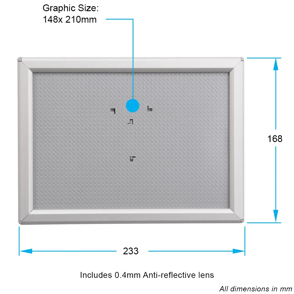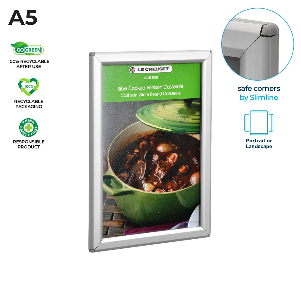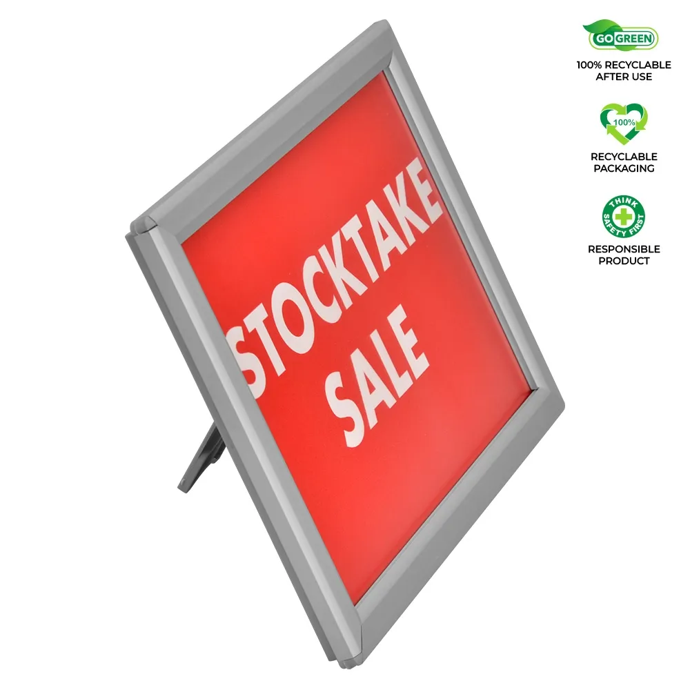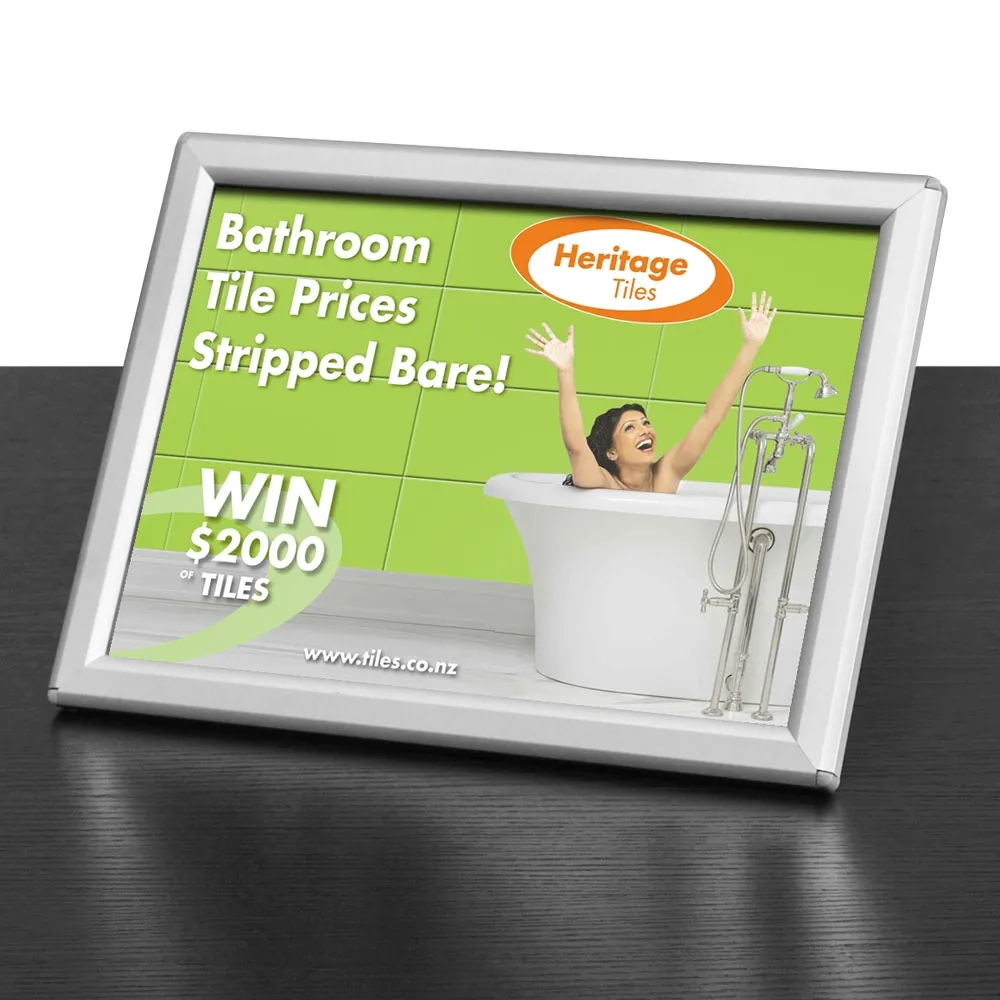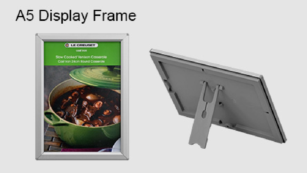 This exclusive patented clip frame or snap frame display can be used in a variety of applications such as a point of sale sign, price displays, counter top sign or photo frame. The key to versatility and low price of these A5 clip frames is the injection moulded backing, providing a durable display that can be used anywhere.