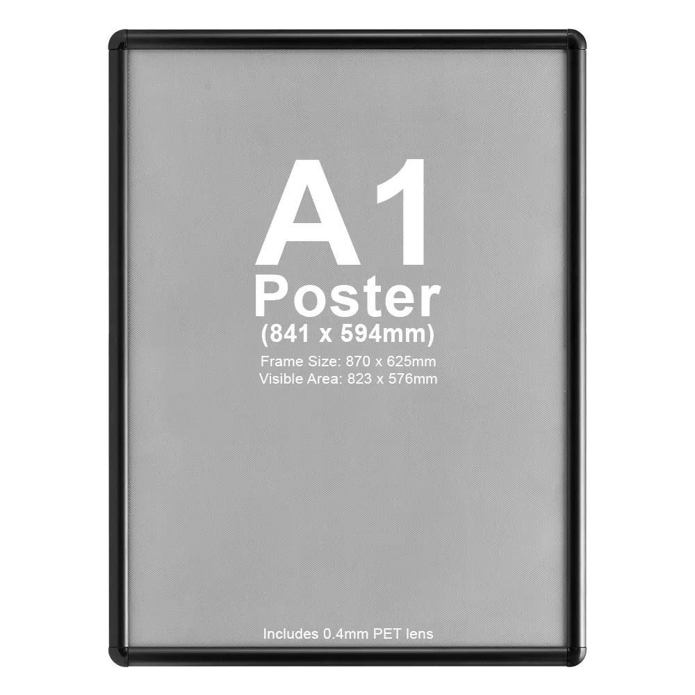 - Poster holder displays an A1 (841 x 594mm) standard sized graphic in portrait or landscape format