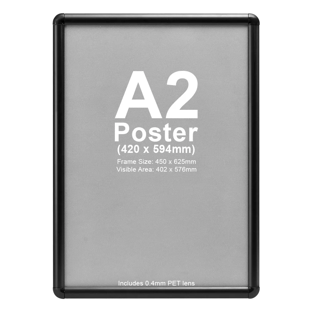 The snap frame displays, A2 picture frames are designed to hold A2 (594 x 420mm) graphics in either portrait or landscape orientation for a versatile display. The frame itself is made from aluminium to provide a lightweight, durable unit that will last for years to come in any location. The black finish adds a sleek look that works well with any décor!